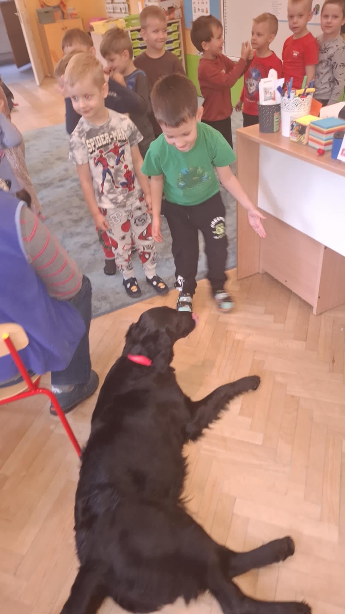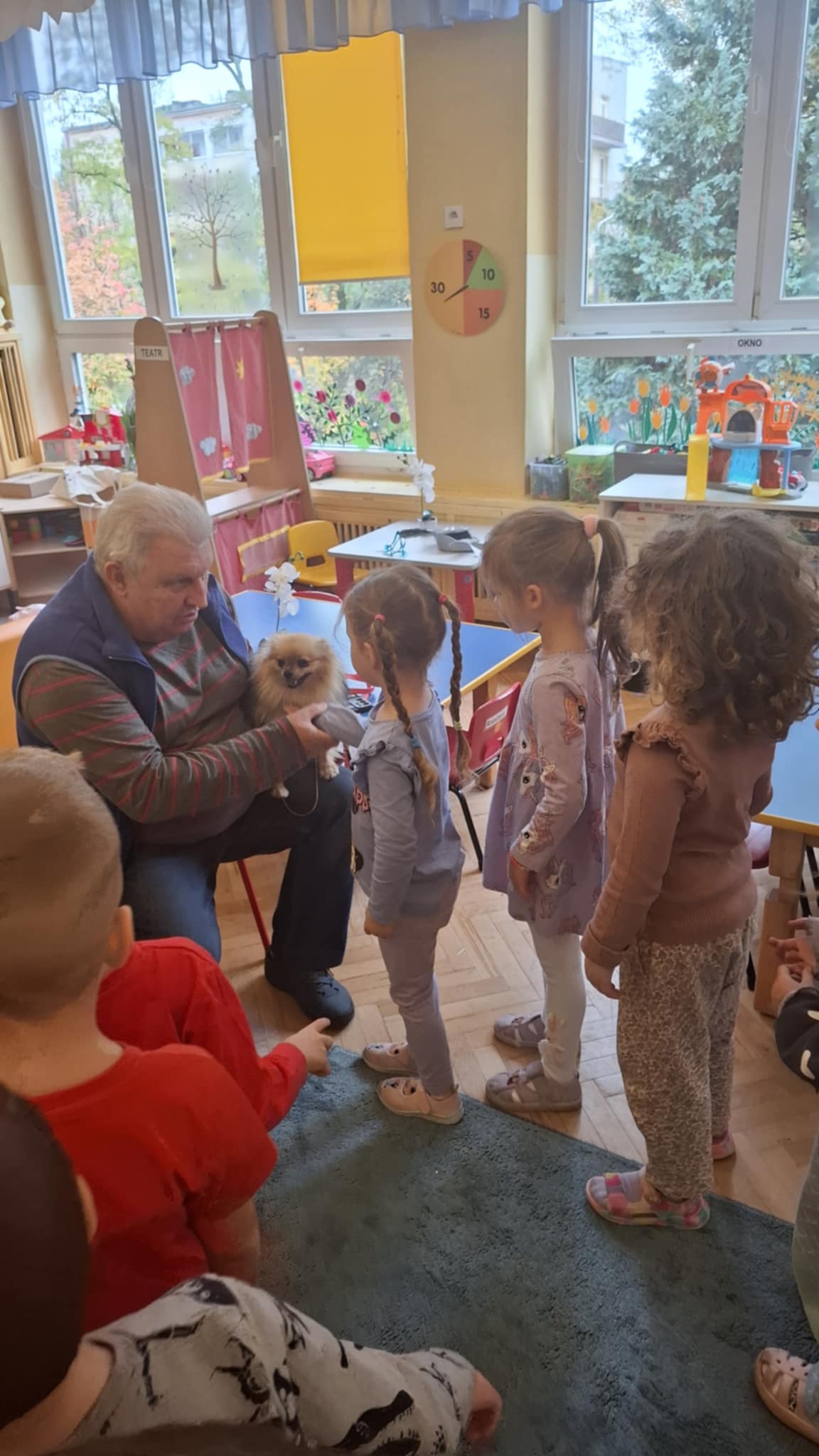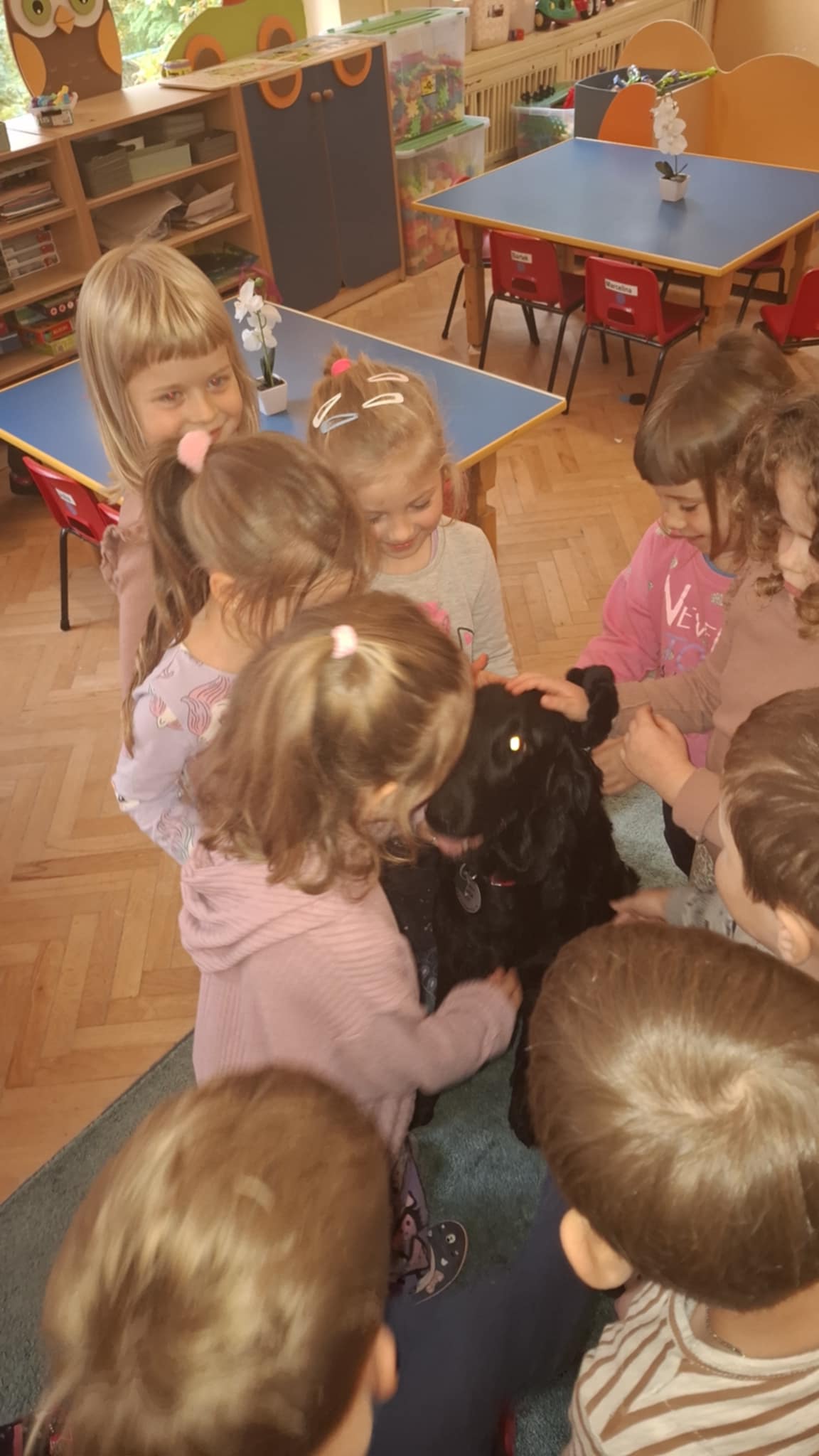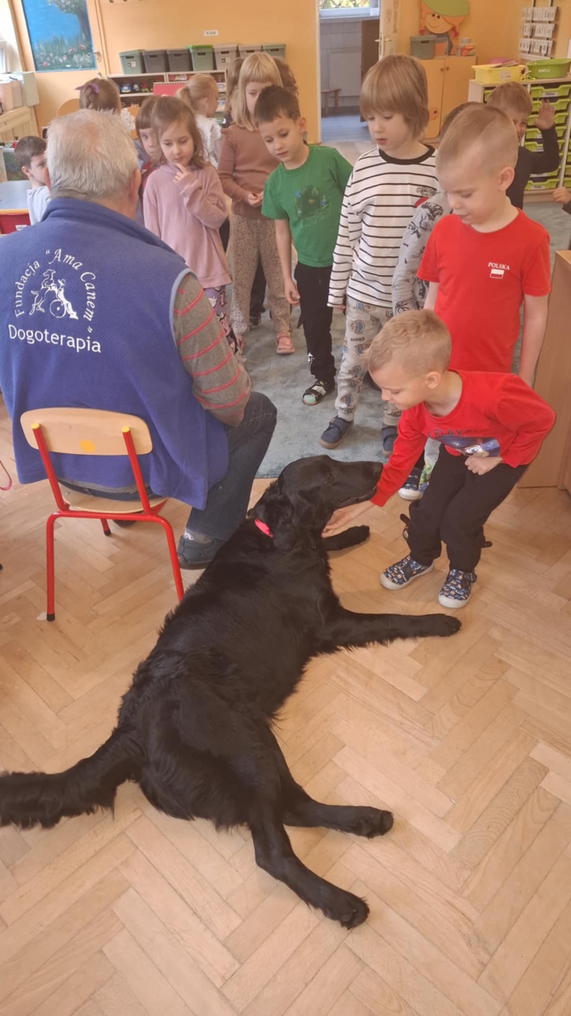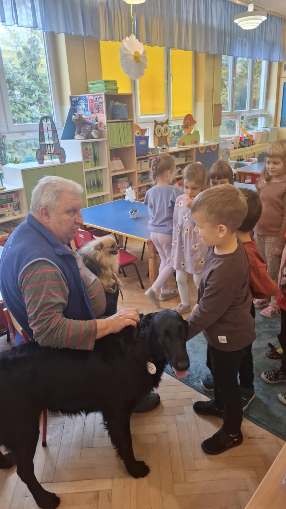 14.10.2025 r gościliśmy w naszym przedszkolu Psich Terapeutów instruktorami z Fundacji Ama Canem z Łodzi, którzy dla wszystkich grup przedszkolnych poprowadzili zajęcia na temat, bezpieczne zachowania się podczas kontaktu z psem. Dzieci dowiedziały się, w jaki sposób powinny postępować w różnych sytuacjach np. podczas zagrożenia ze strony obcego zwierzęcia. Zajęciom edukacyjnym towarzyszyła również zabawa z psami np. przechodzenie nad psem, pod a także głaskanie pupilów i nauka witania .