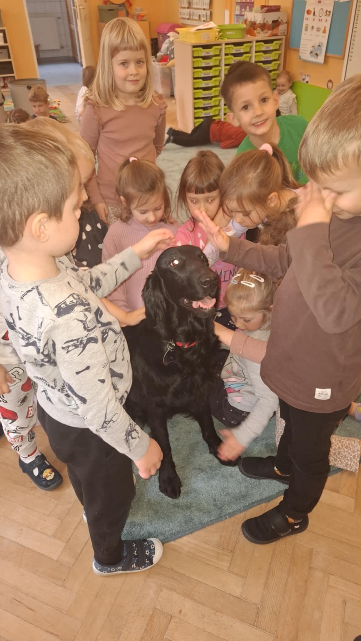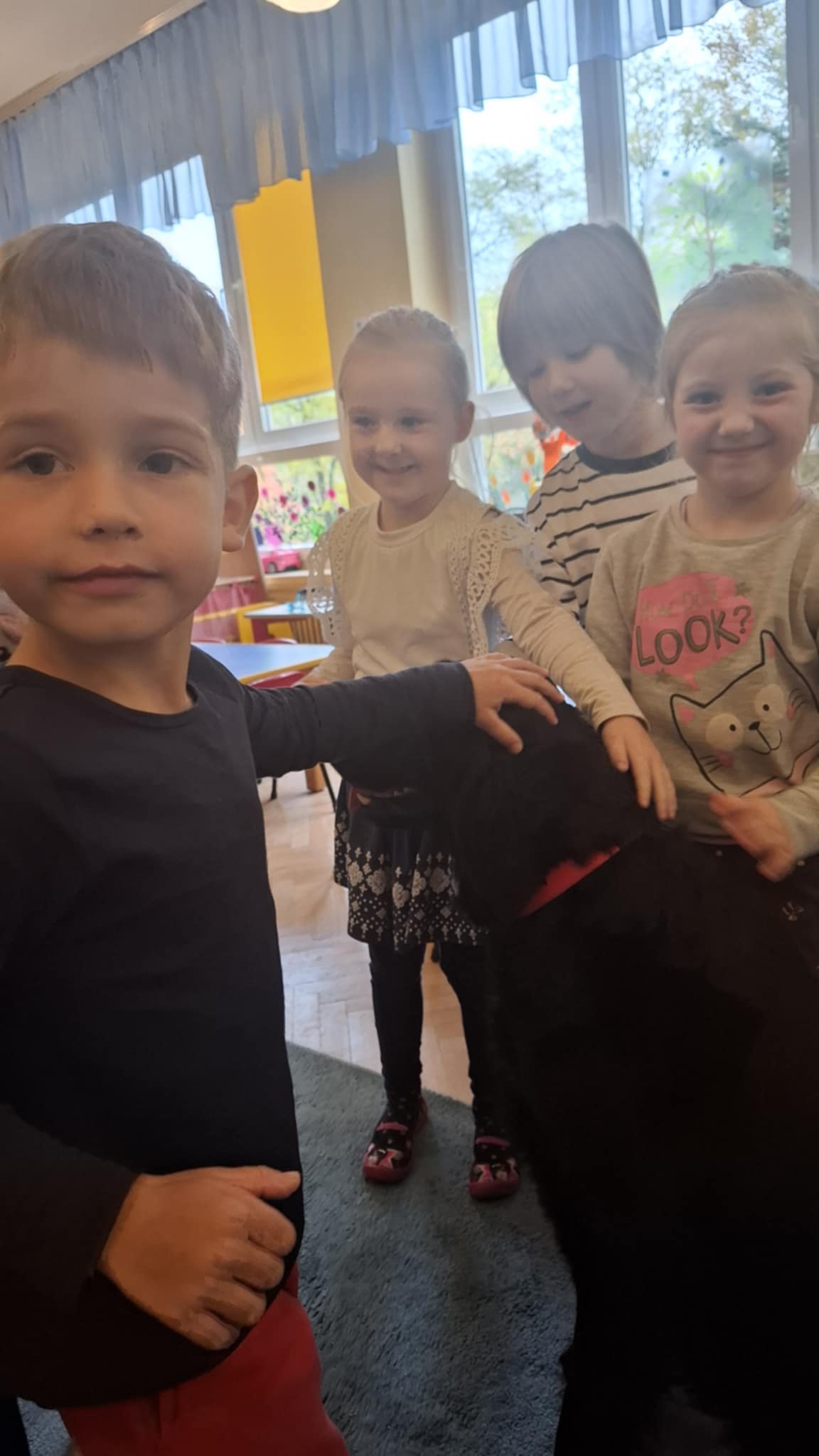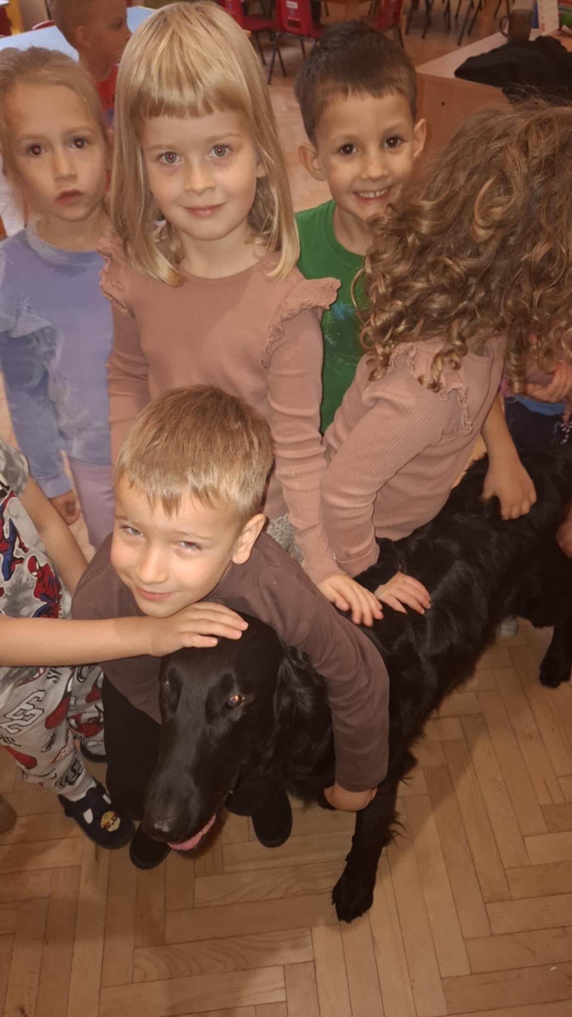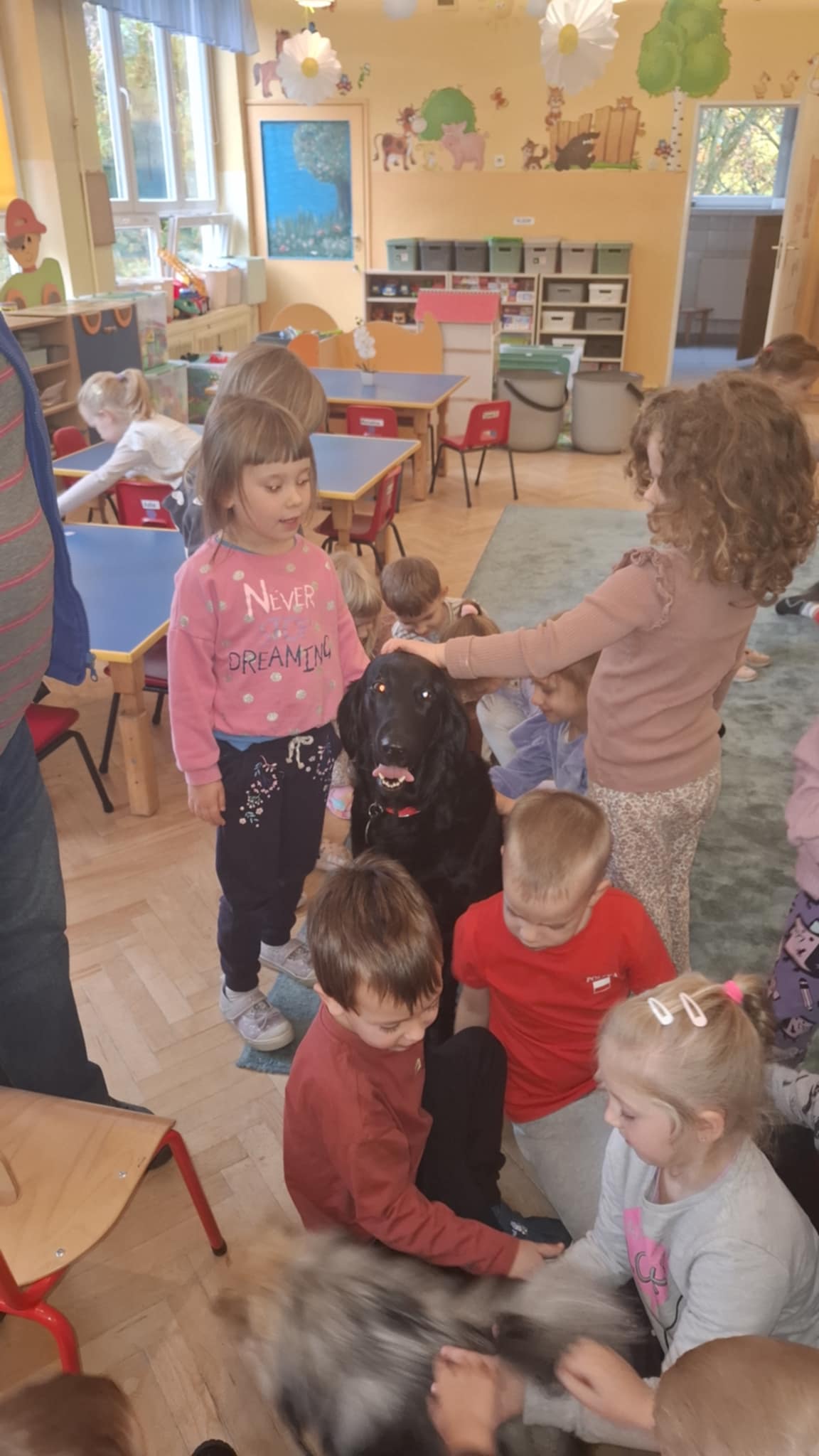 14.10.2025 r gościliśmy w naszym przedszkolu Psich Terapeutów instruktorami z Fundacji Ama Canem z Łodzi, którzy dla wszystkich grup przedszkolnych poprowadzili zajęcia na temat, bezpieczne zachowania się podczas kontaktu z psem. Dzieci dowiedziały się, w jaki sposób powinny postępować w różnych sytuacjach np. podczas zagrożenia ze strony obcego zwierzęcia. Zajęciom edukacyjnym towarzyszyła również zabawa z psami np. przechodzenie nad psem, pod a także głaskanie pupilów i nauka witania .