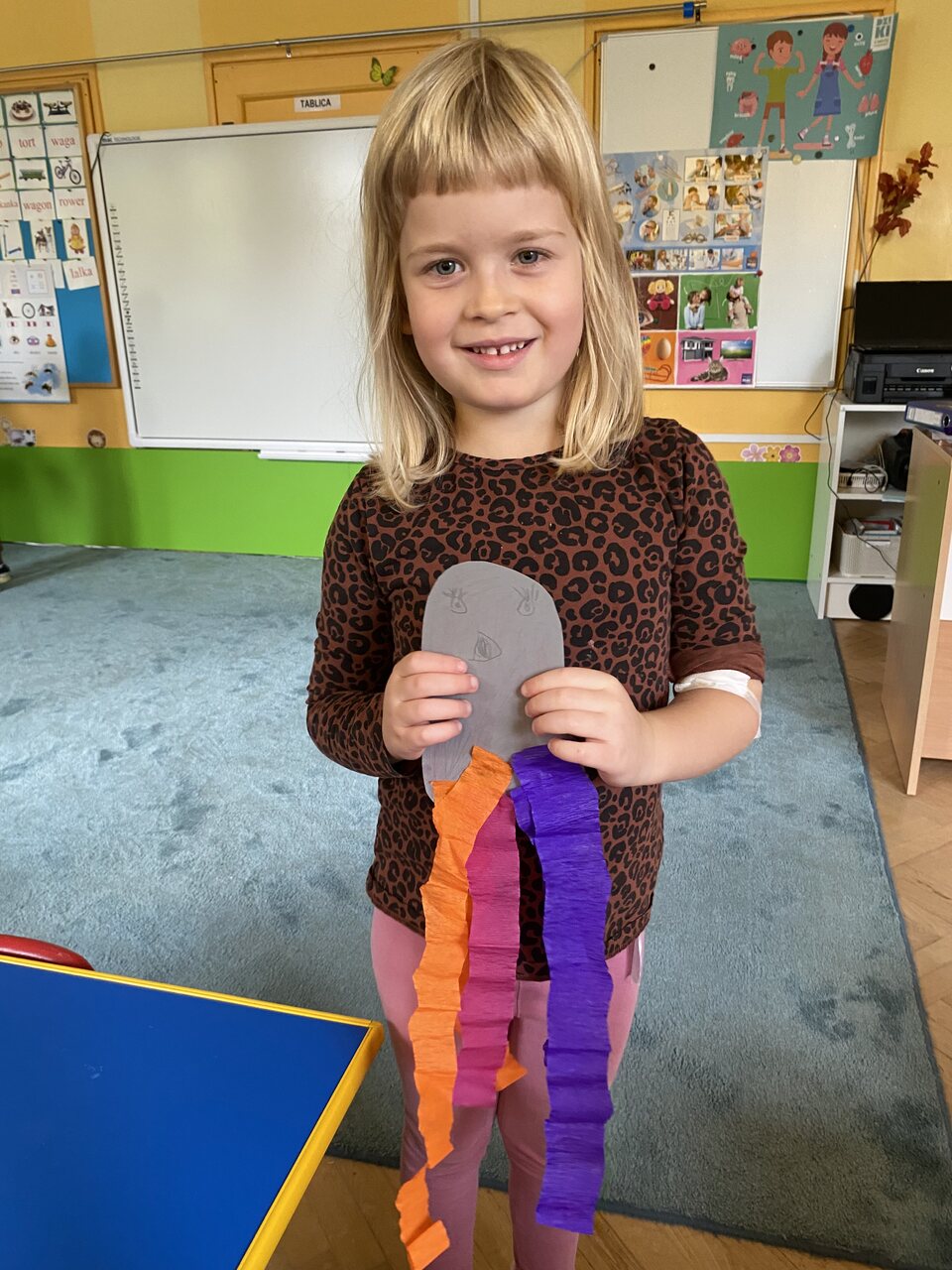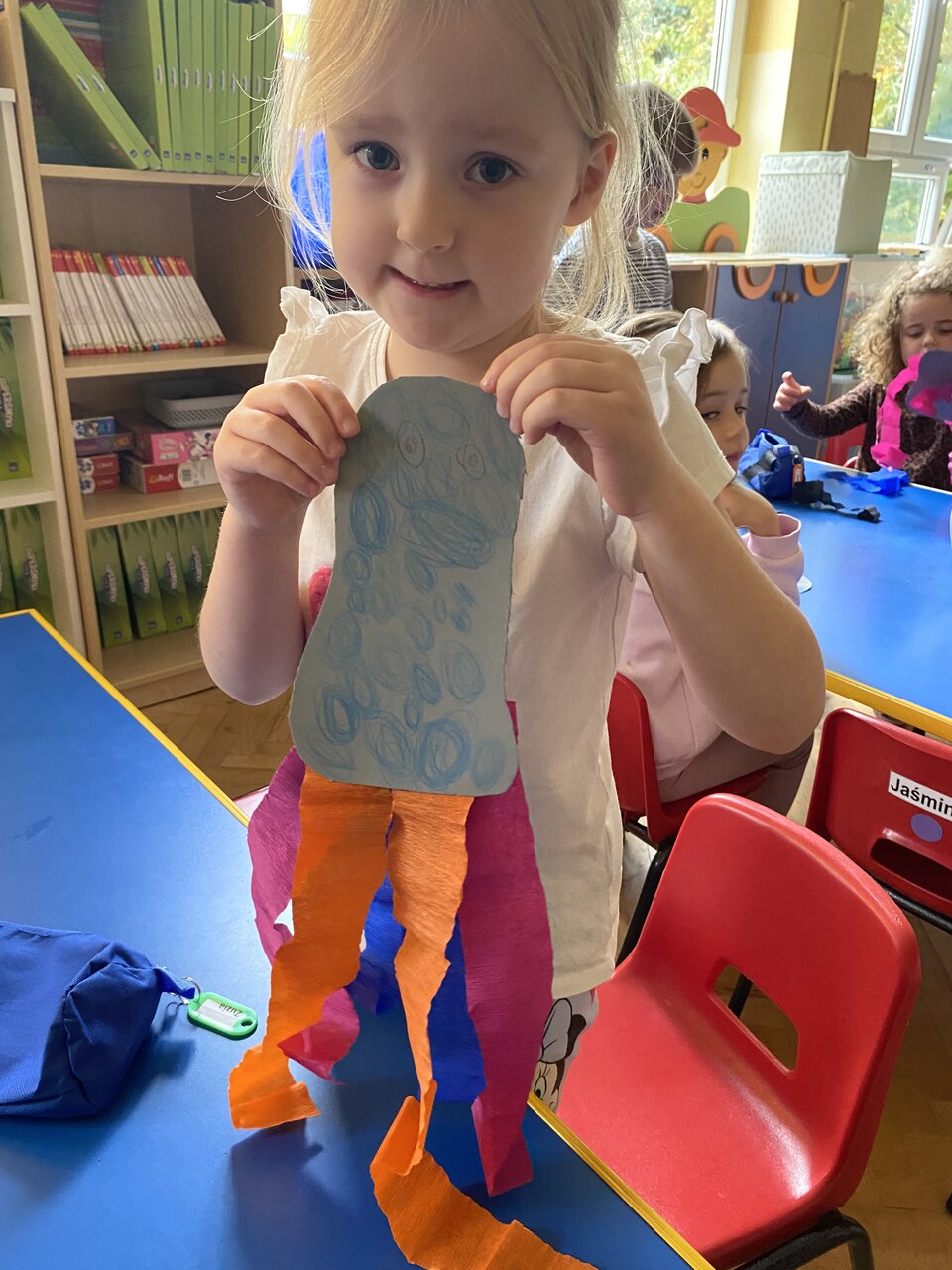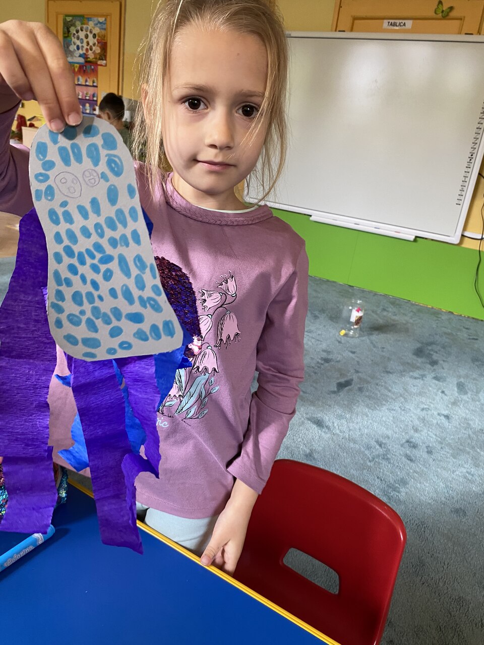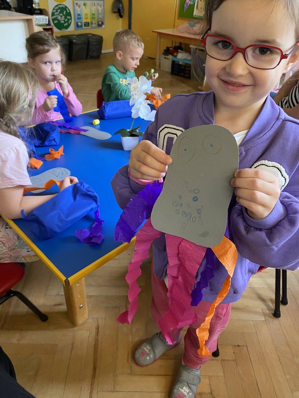 Po dawce ciekawych informacji przyszedł czas na matematyczne zagadki, które pozwoliły utrwalić nasze umiejętności liczenia. Zabawy ruchowe związane z życiem ośmiornicy dały dzieciom dużo radości i zabawy. Zwieńczeniem naszych zajęć było wykonanie kolorowej ośmiornicy.