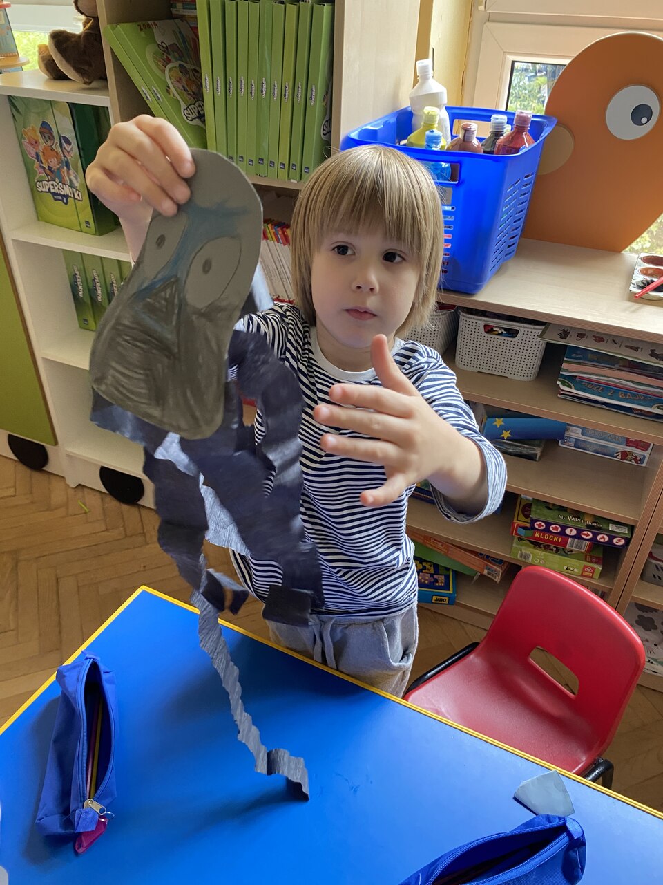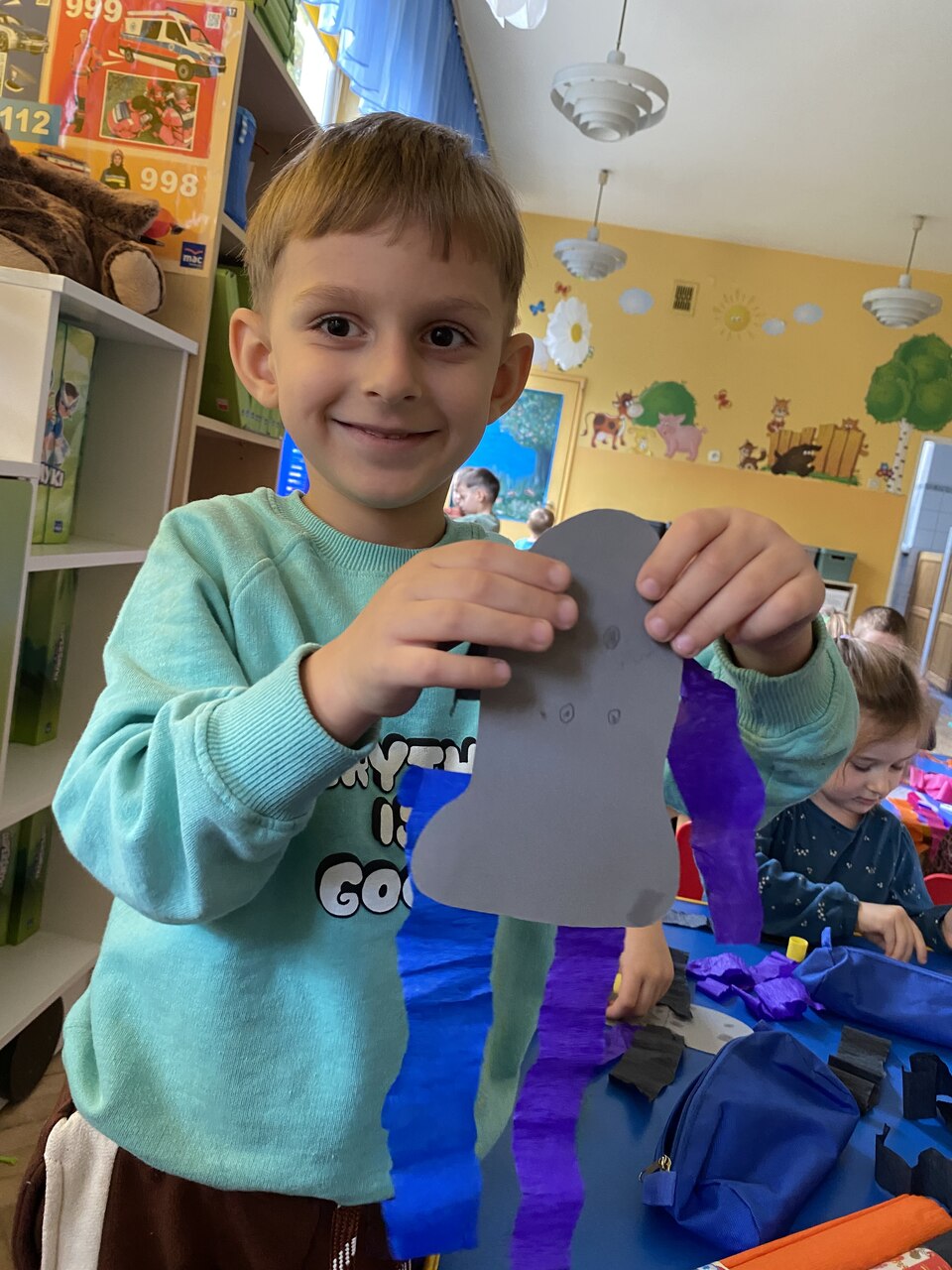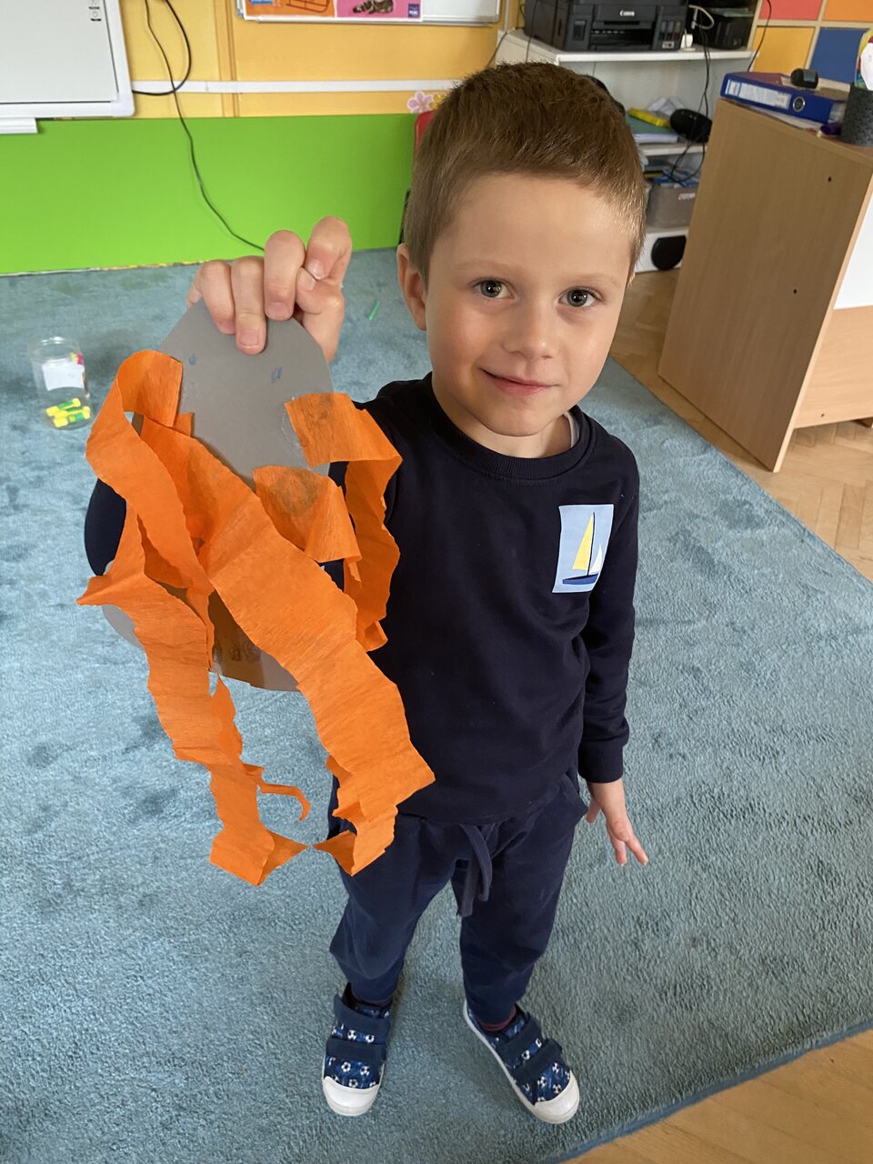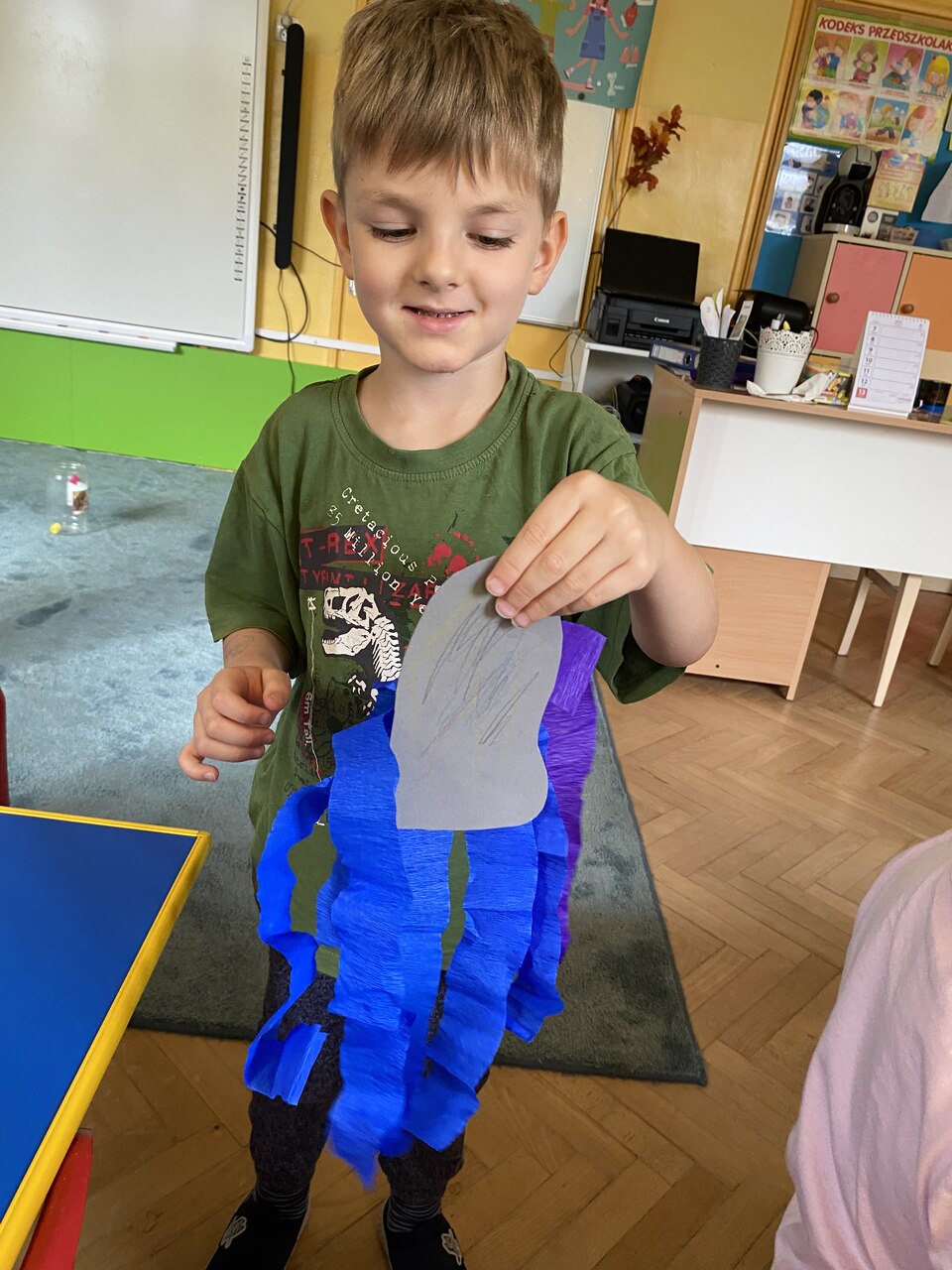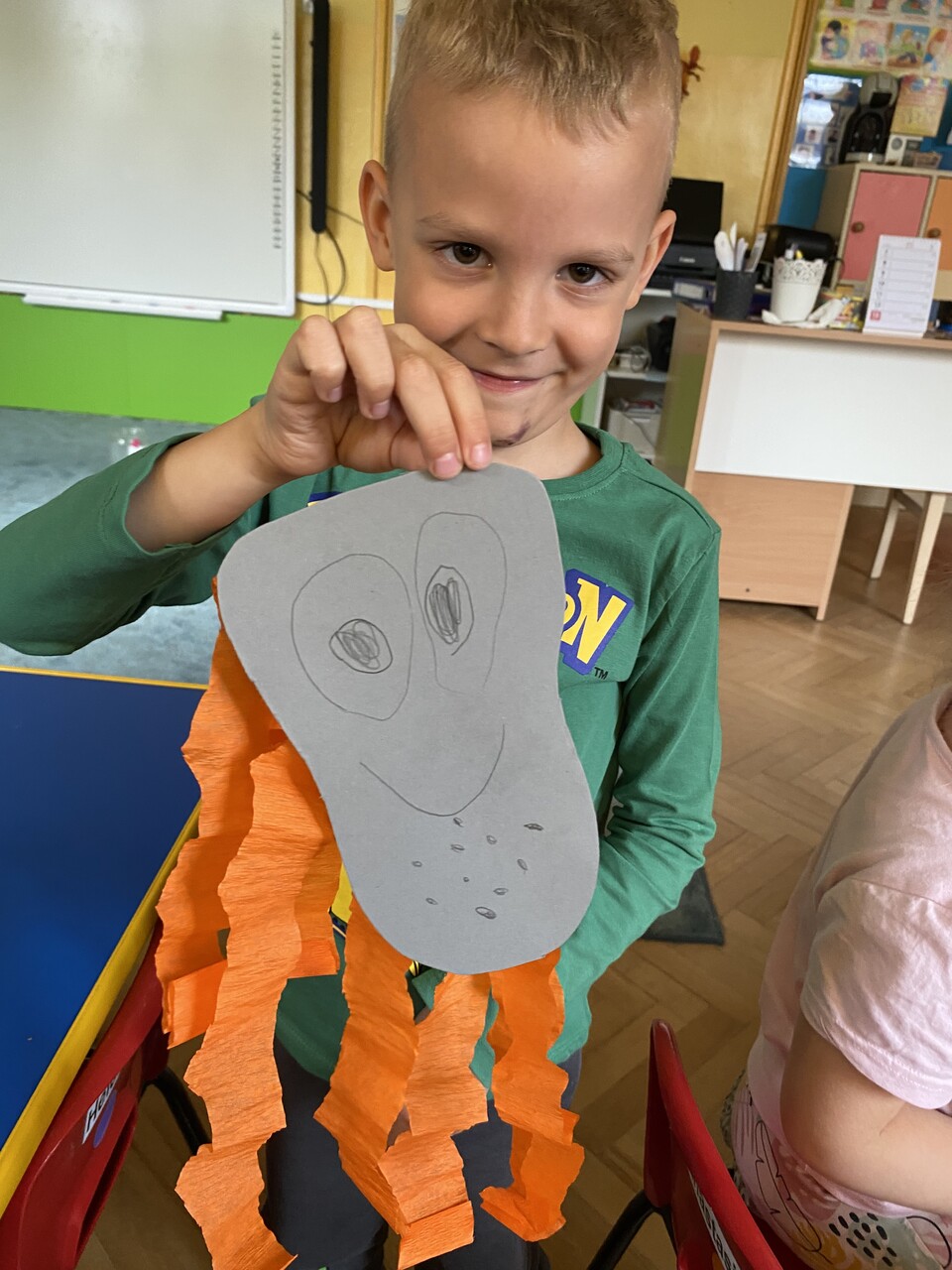 Po dawce ciekawych informacji przyszedł czas na matematyczne zagadki, które pozwoliły utrwalić nasze umiejętności liczenia. Zabawy ruchowe związane z życiem ośmiornicy dały dzieciom dużo radości i zabawy. Zwieńczeniem naszych zajęć było wykonanie kolorowej ośmiornicy.