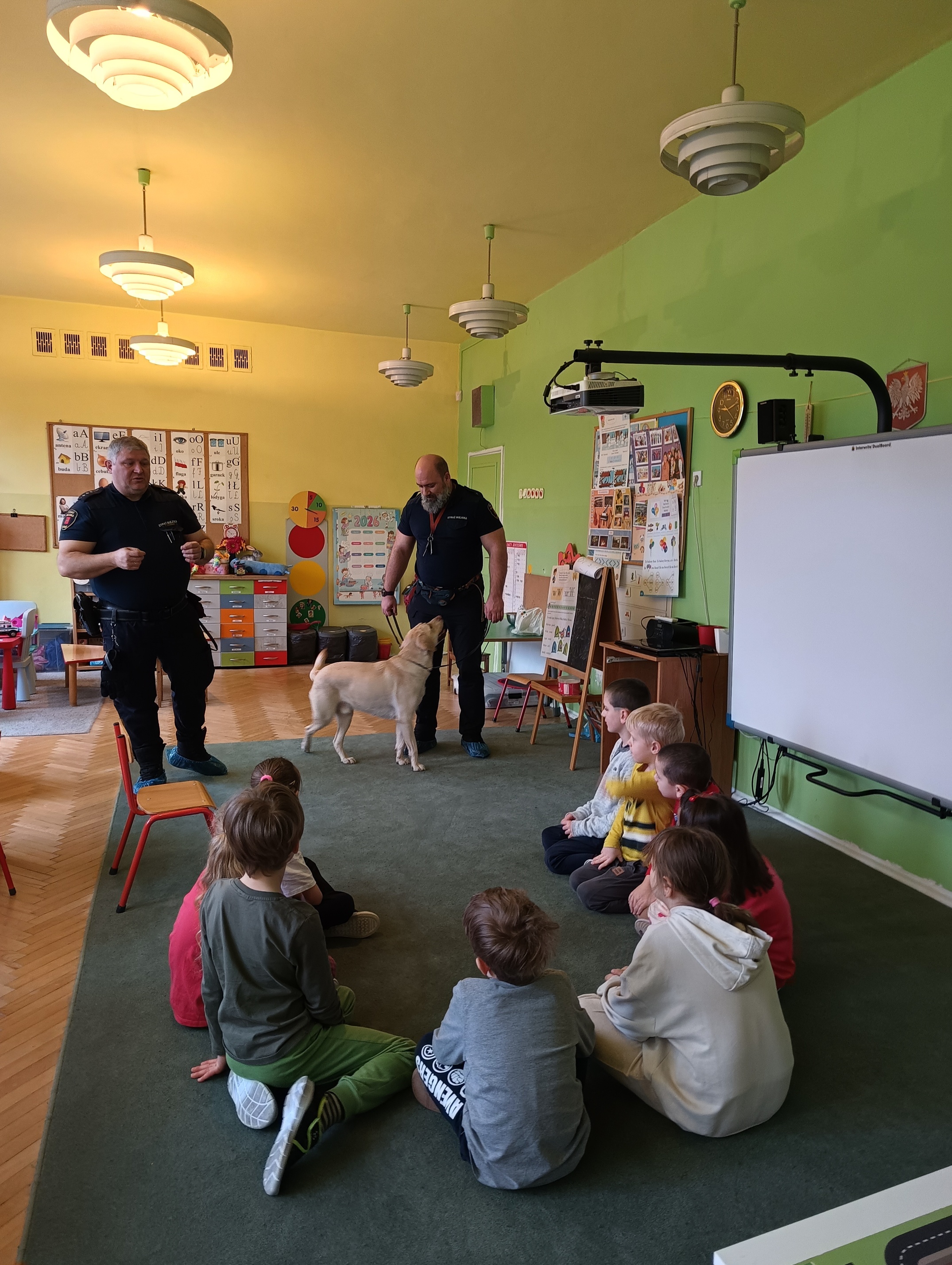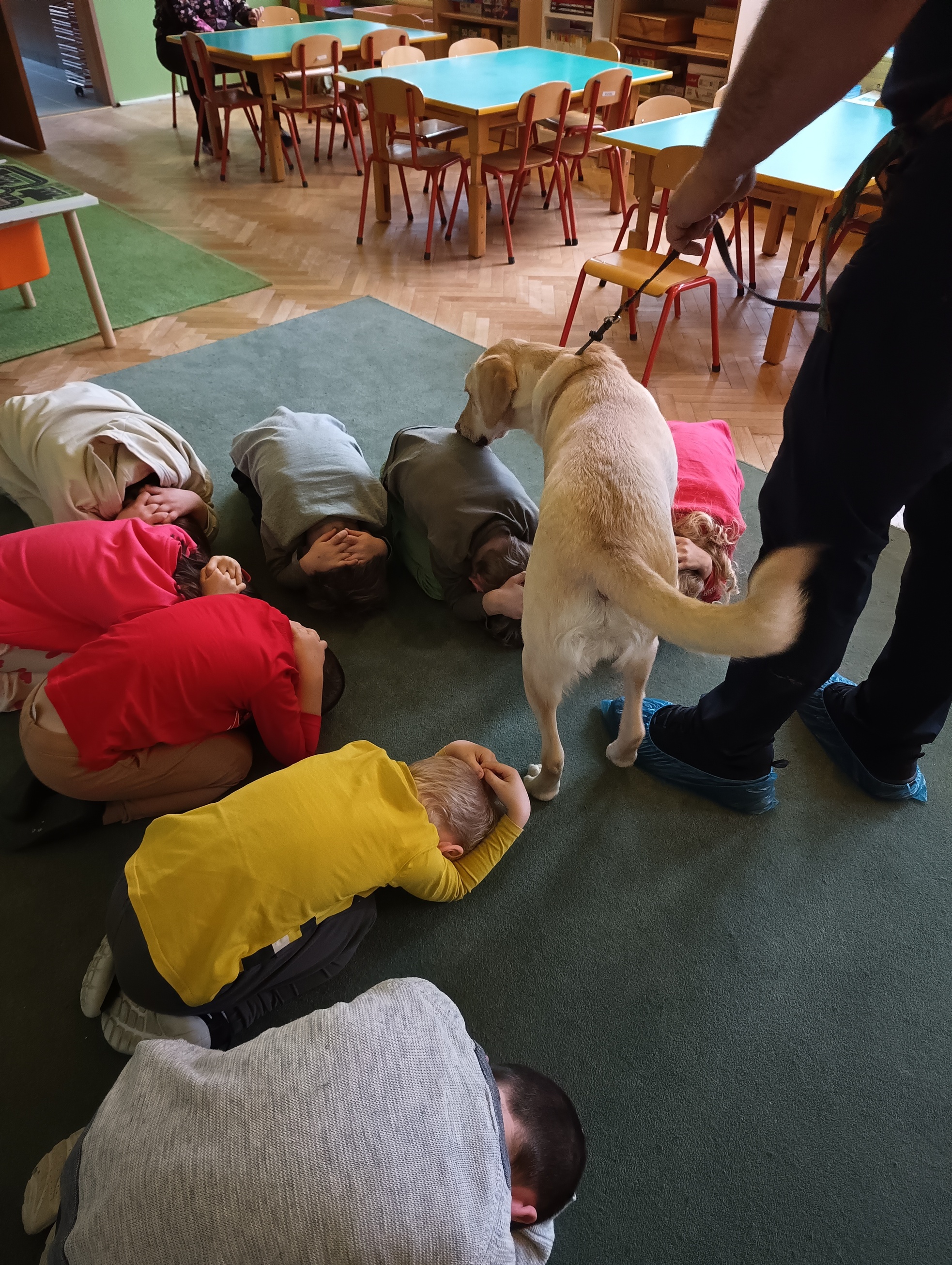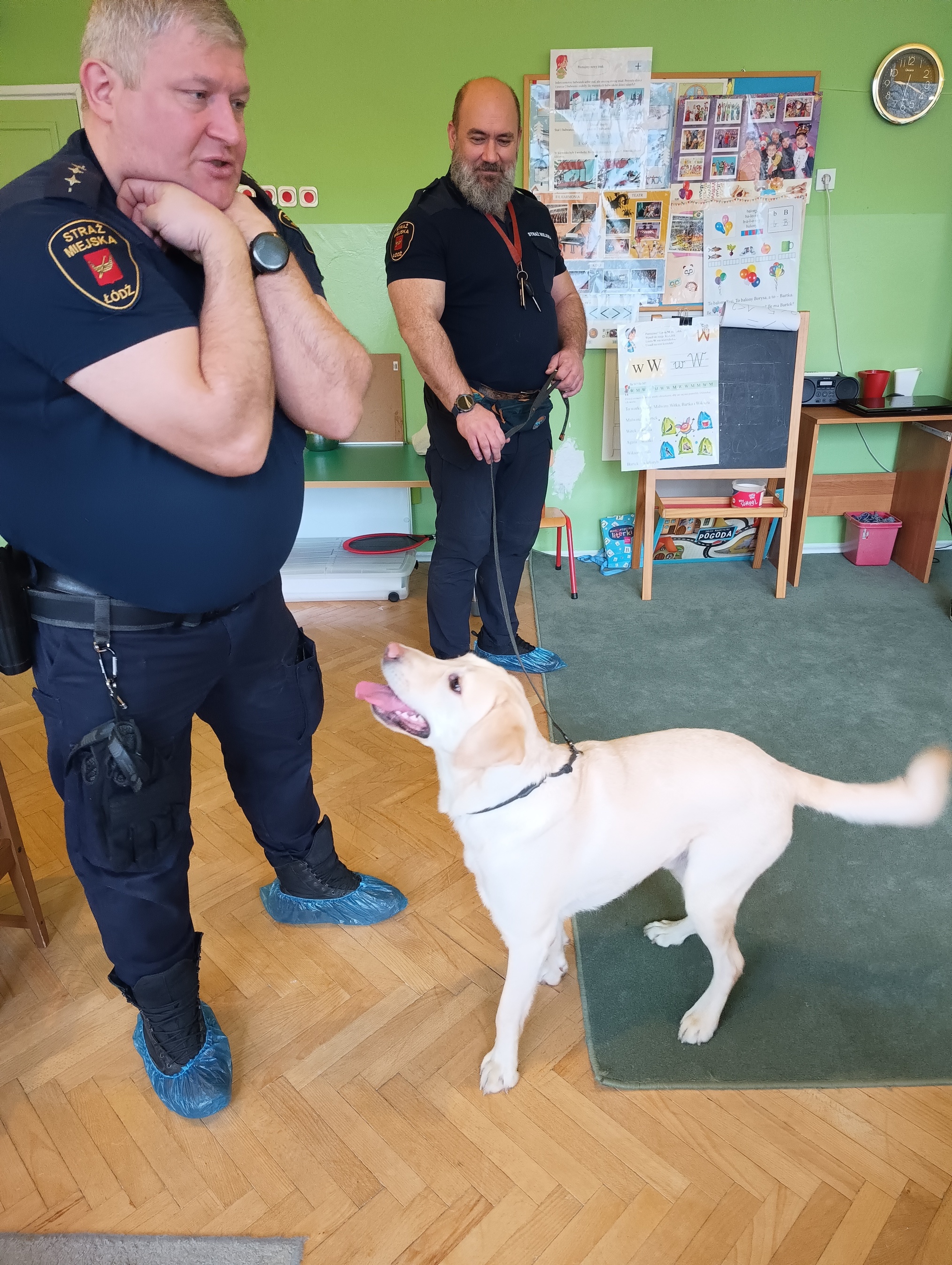 Dzisiaj gościliśmy w przedszkolu Strażników Straży Miejskiej wraz z ich podopiecznym labradorem Maksem. Maks wraz ze swoim opiekunem odwiedzają przedszkola i prowadzą zajęcia dla dzieci, które mają uświadamiać, jak ważny jest szacunek do zwierząt i ich odpowiednie traktowanie. Panowie strażnicy nauczyli nas ,jak zachowywać się w obecności nieznanych zwierząt oraz jaka postawę obronną przyjąć na wypadek ich ataku. Maks, to wspaniały nauczyciel i cudowny funkcjonariusz.