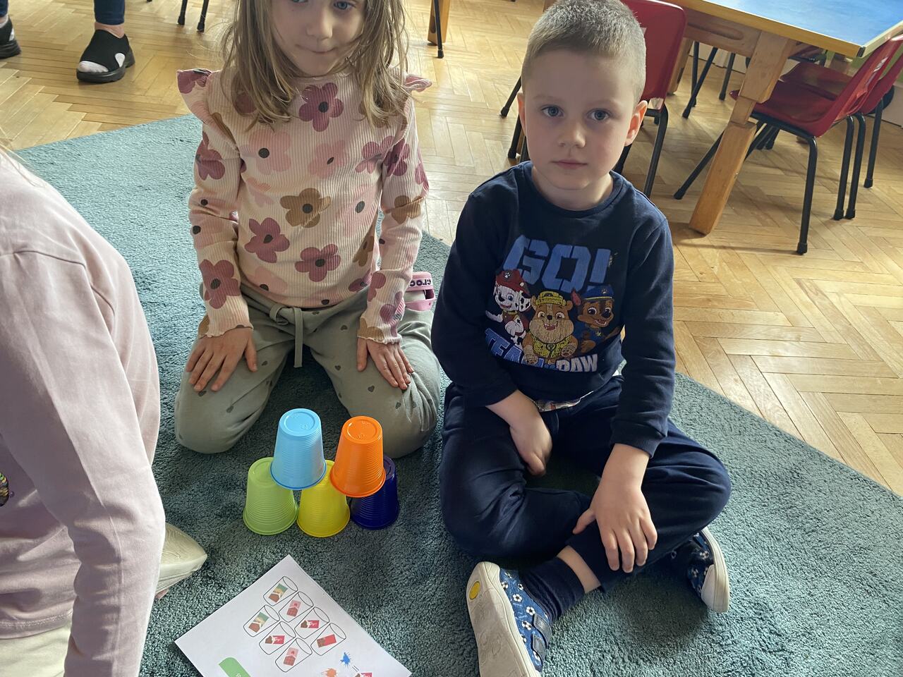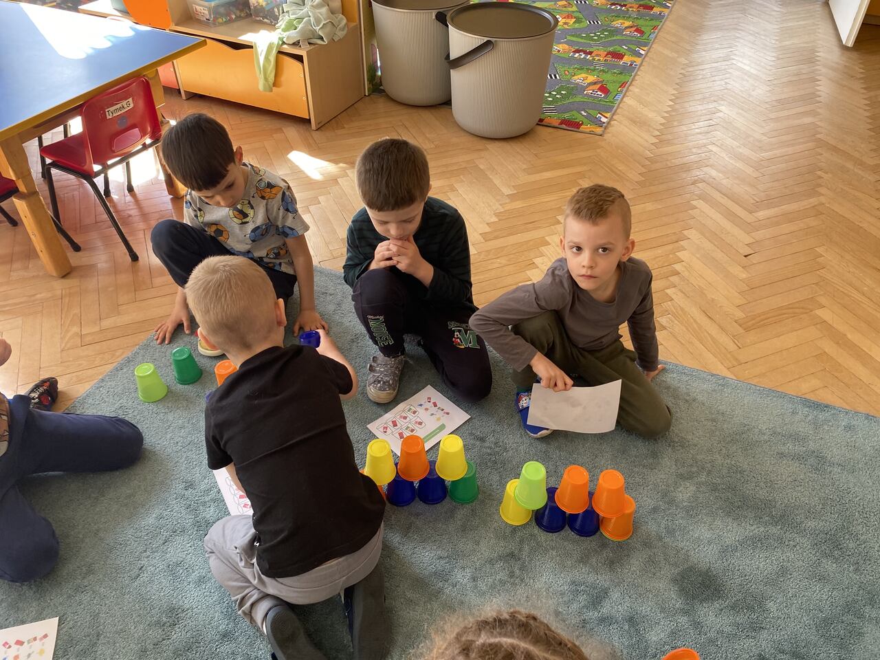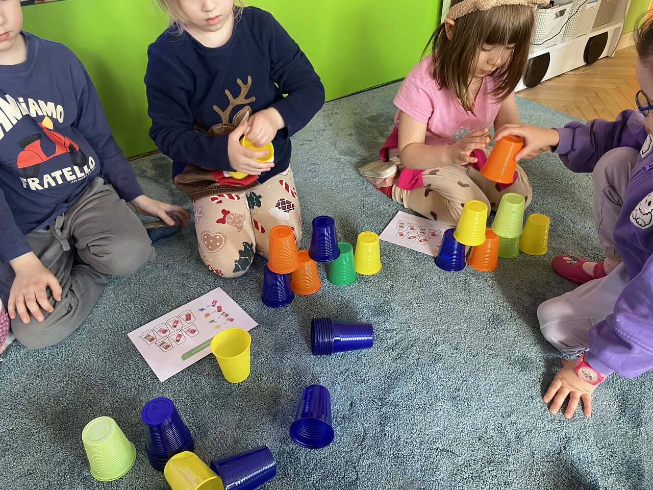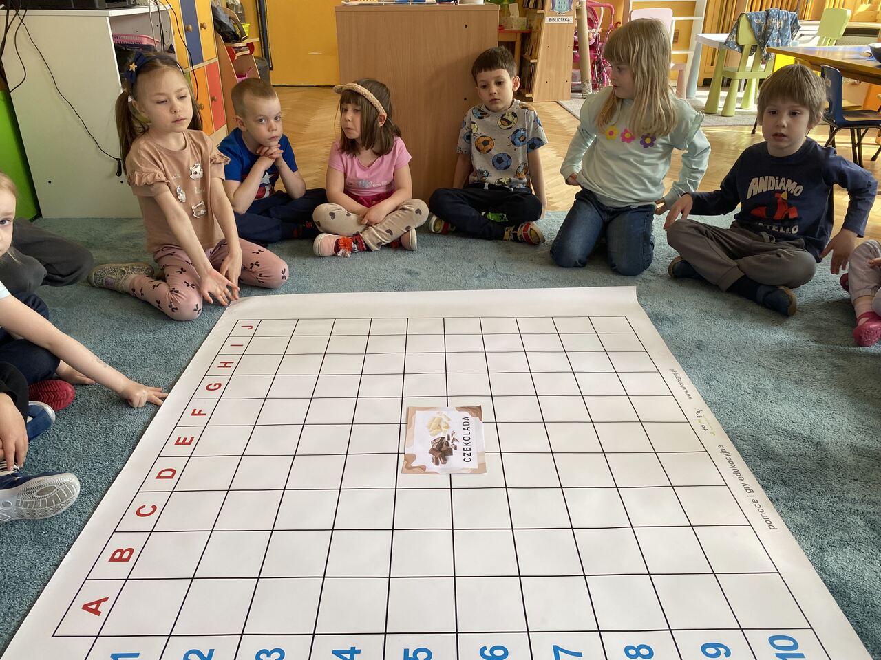 Podczas zajęć przedszkolaki ułożyły i odczytały napis „czekolada” na planszy do kodowania, pracując według podanych koordynatów. Następnie układały z kolorowych kubków piramidy według wzoru – ćwicząc przy tym współpracę w grupie oraz umiejętność przeliczania.