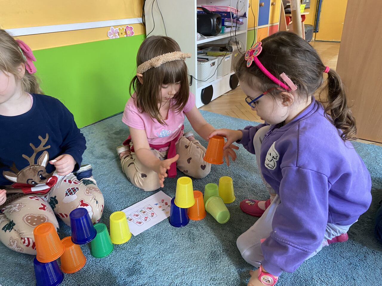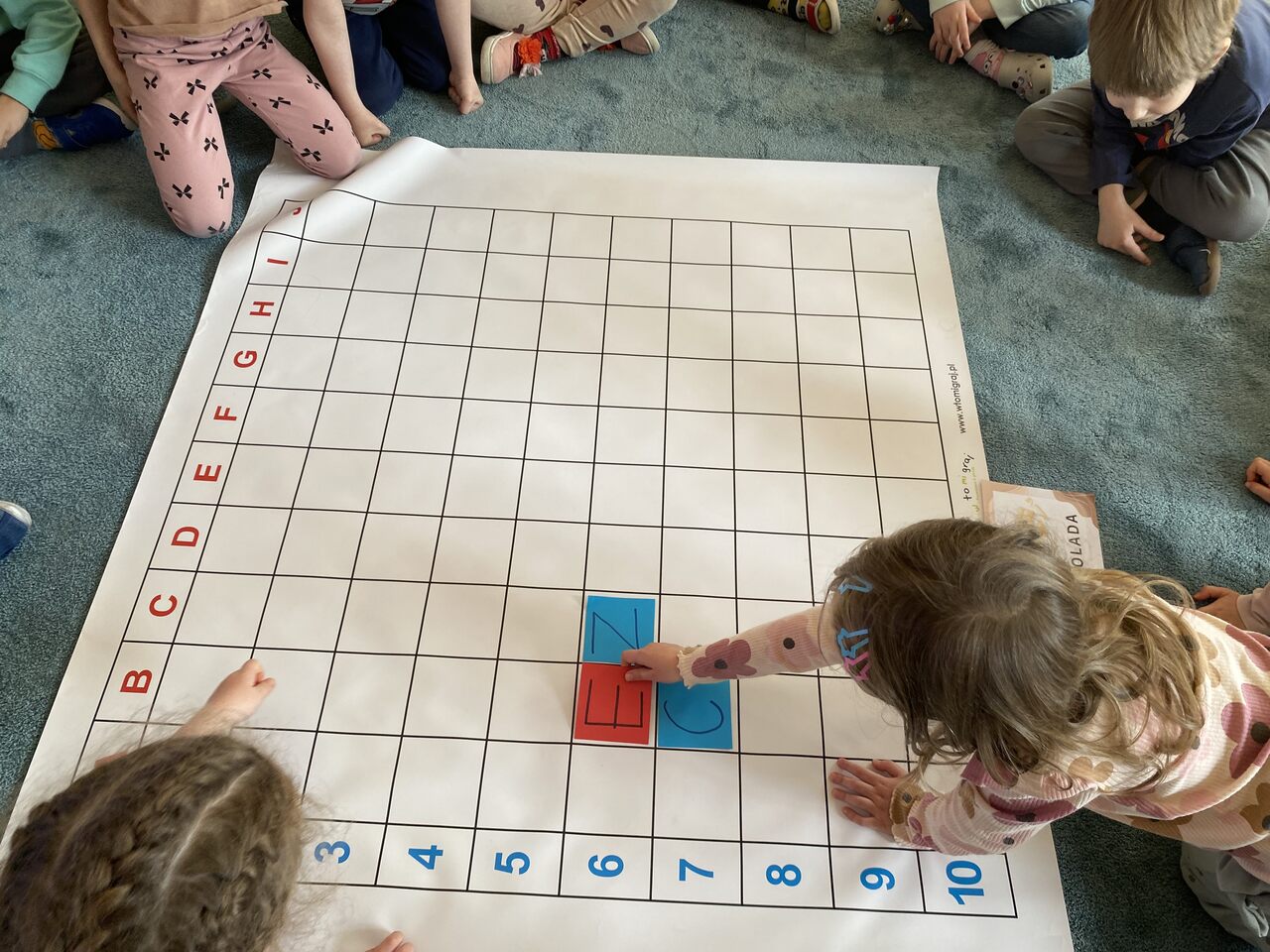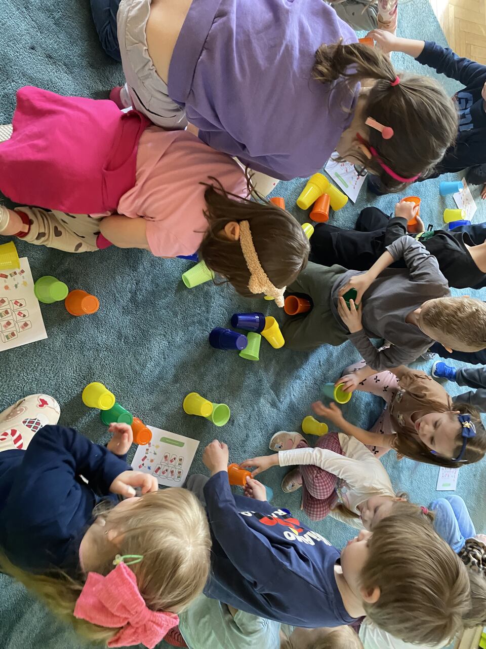 Podczas zajęć przedszkolaki ułożyły i odczytały napis „czekolada” na planszy do kodowania, pracując według podanych koordynatów. Następnie układały z kolorowych kubków piramidy według wzoru – ćwicząc przy tym współpracę w grupie oraz umiejętność przeliczania.