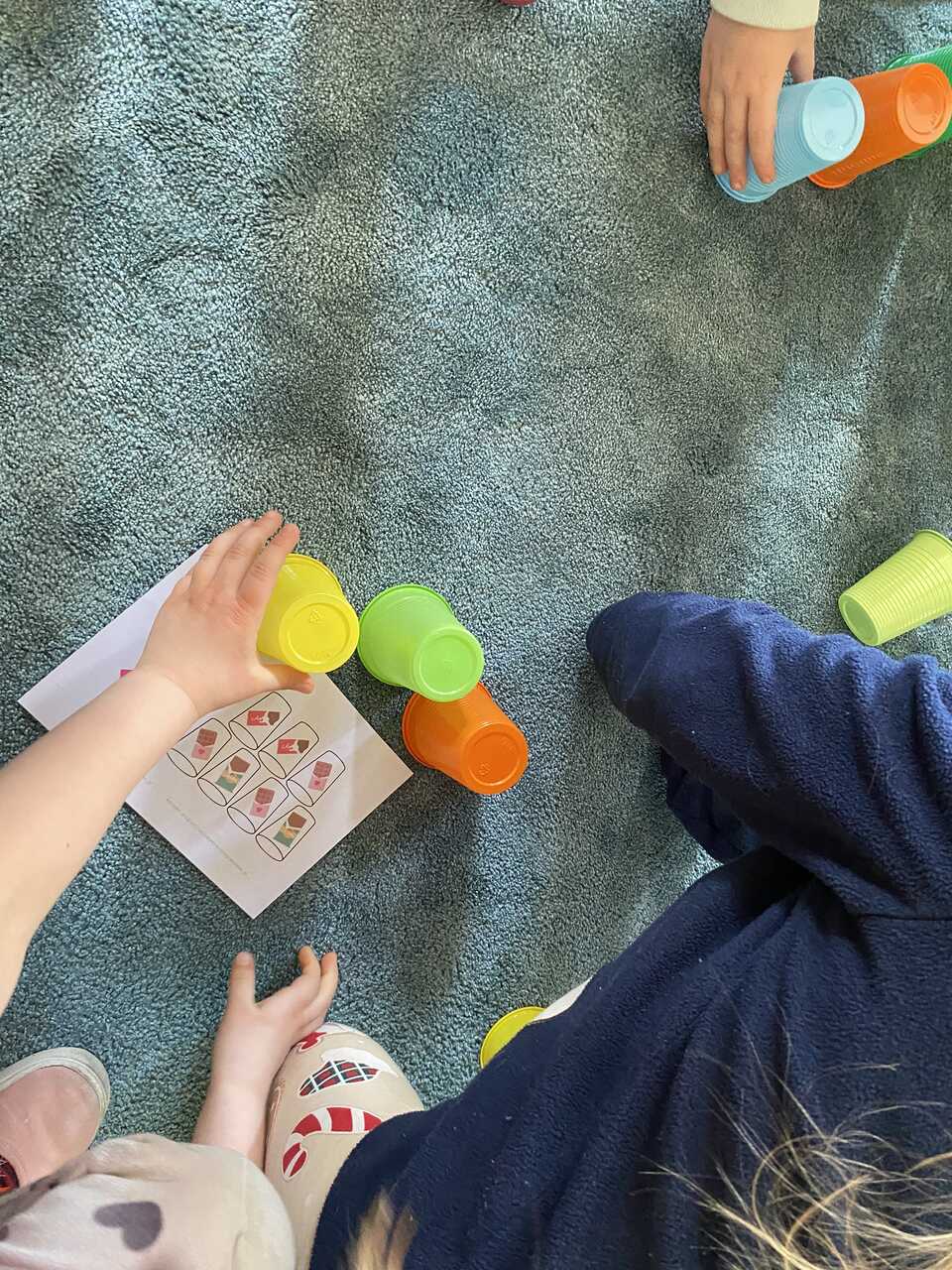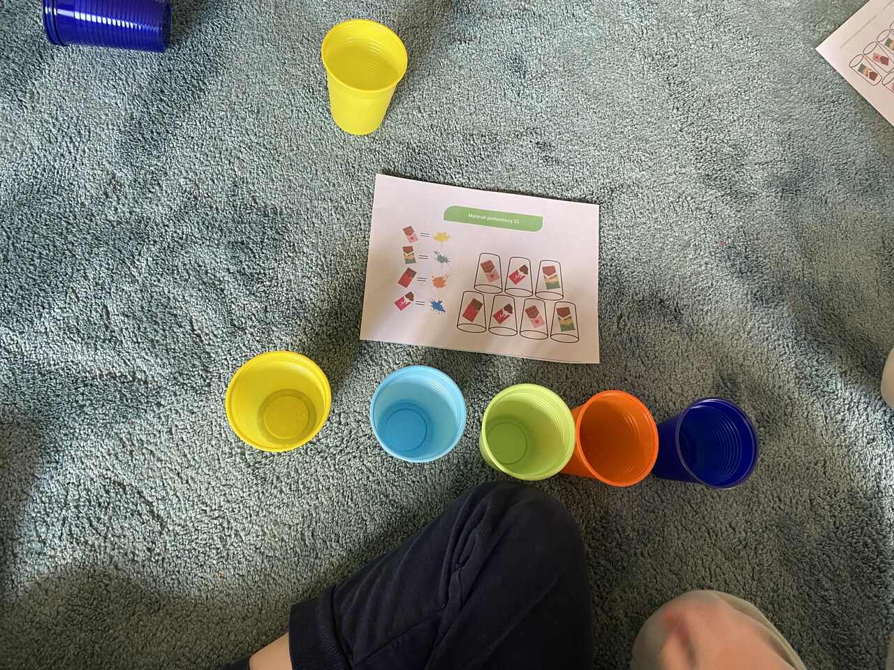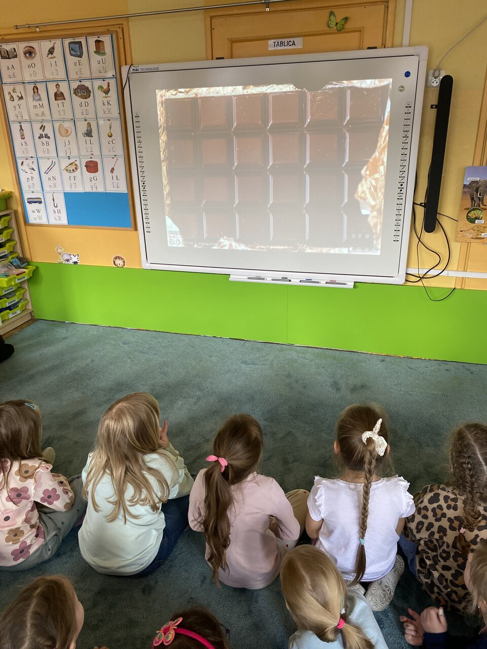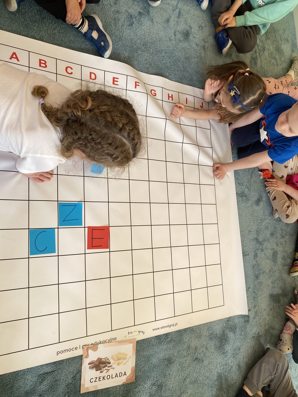 Podczas zajęć przedszkolaki ułożyły i odczytały napis „czekolada” na planszy do kodowania, pracując według podanych koordynatów. Następnie układały z kolorowych kubków piramidy według wzoru – ćwicząc przy tym współpracę w grupie oraz umiejętność przeliczania.