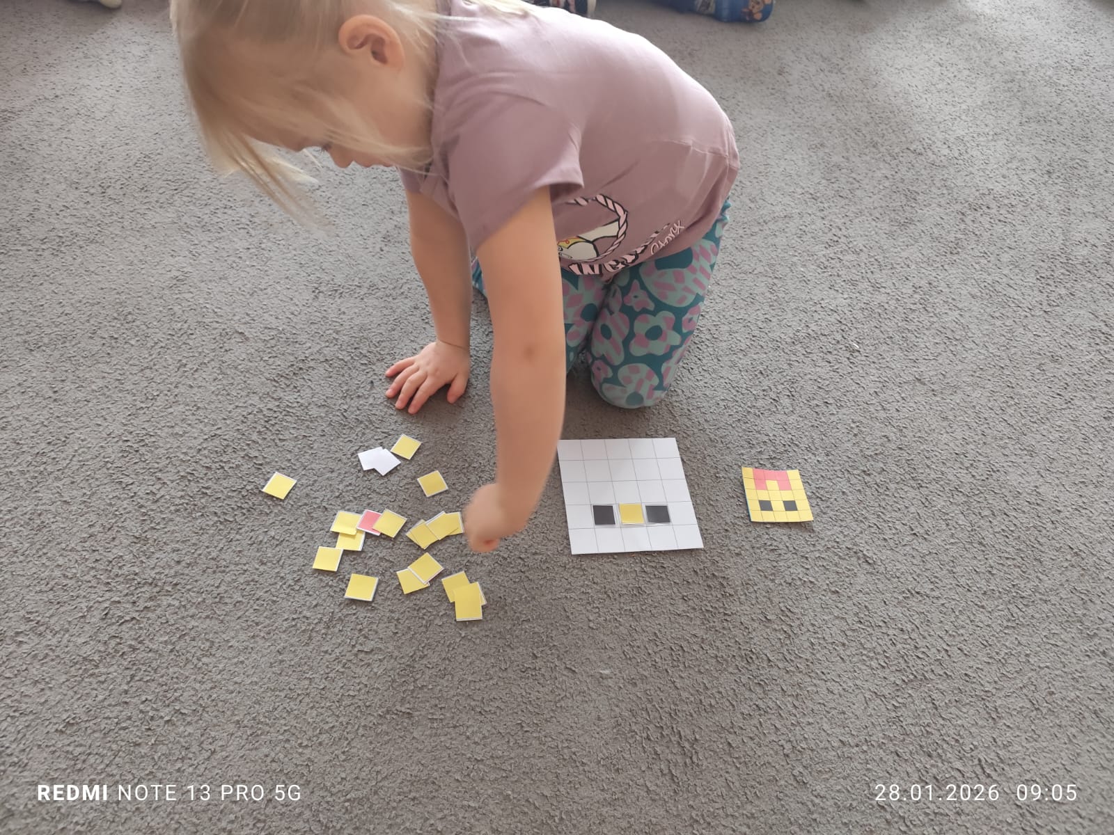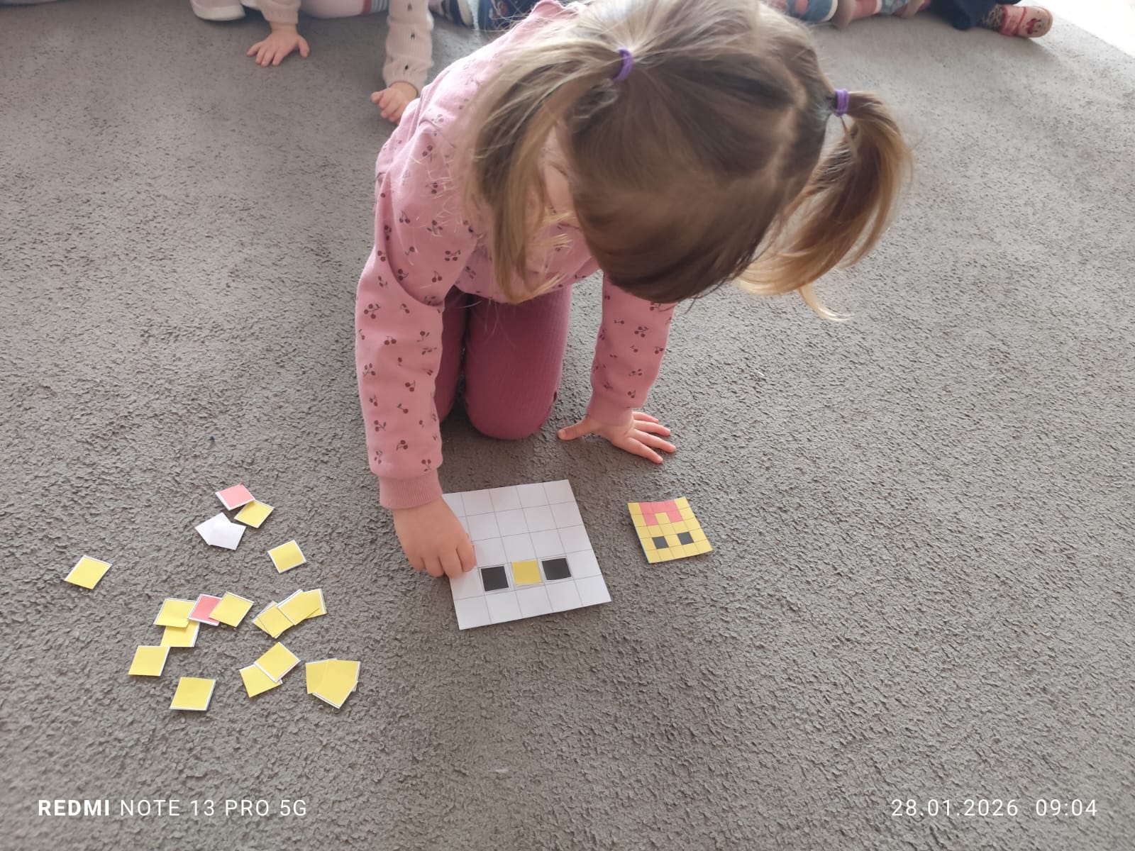 Zadania wymagały od dzieci uważnego słuchania instrukcji, planowania kolejnych kroków oraz odwzorowywania układu kolorów na planszy. Poprzez działania na dywanie i przy stolikach dzieci rozwijały umiejętności kodowania, orientację przestrzenną, koncentrację oraz sprawność manualną.