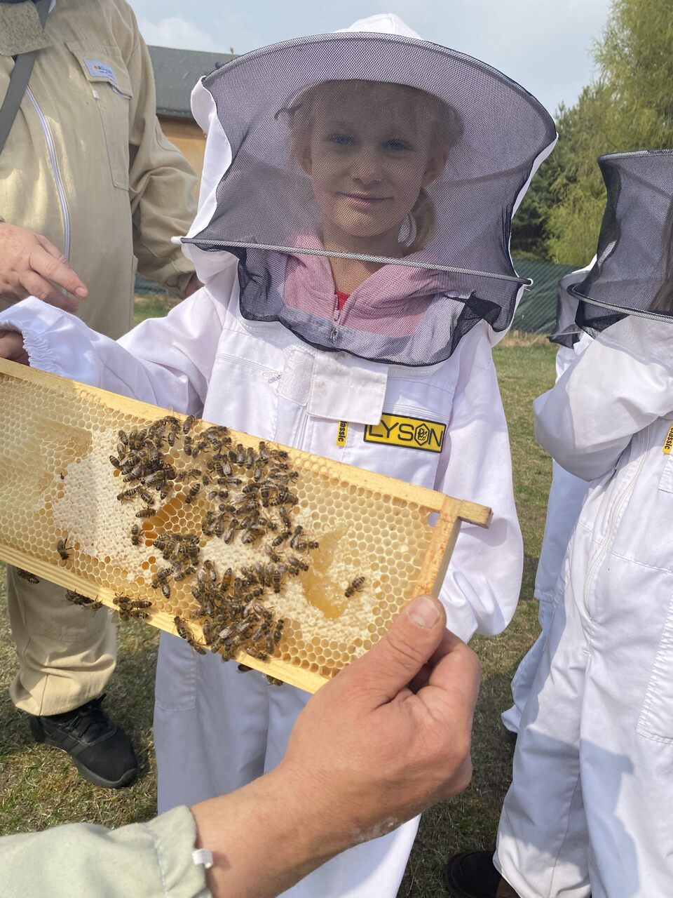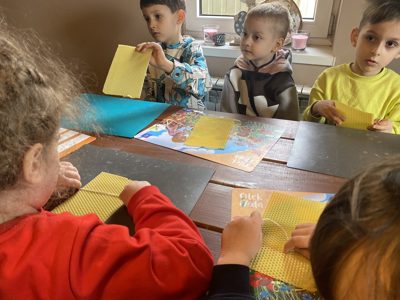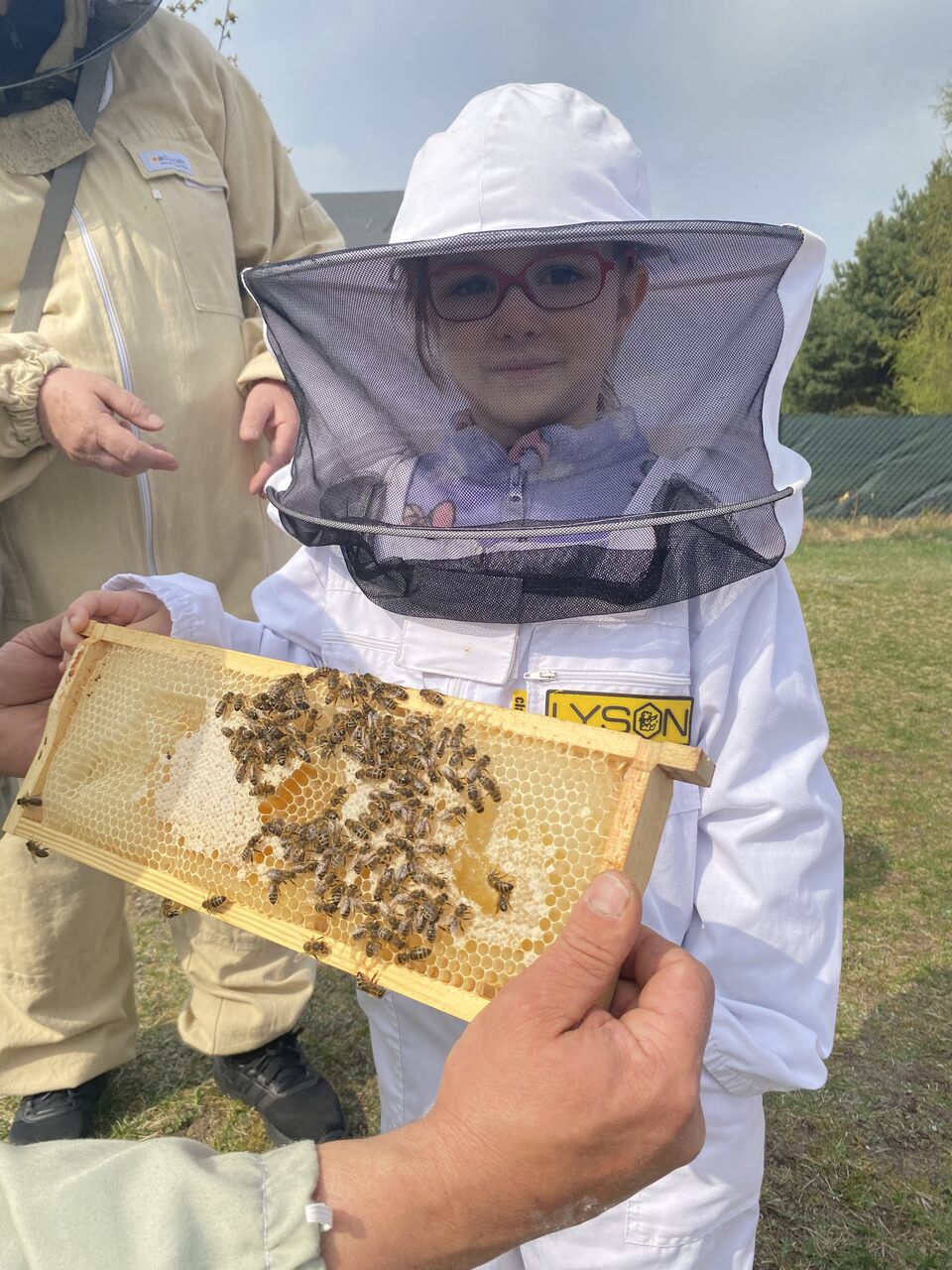 Dzieci miały wyjątkową okazję potrzymać na ręku pszczołę murarkę oraz zobaczyć, jak wygląda ul od wewnątrz. Mogły również z bliska przyjrzeć się pszczołom, trzymając w rękach ramki, na których budują plastry miodu.