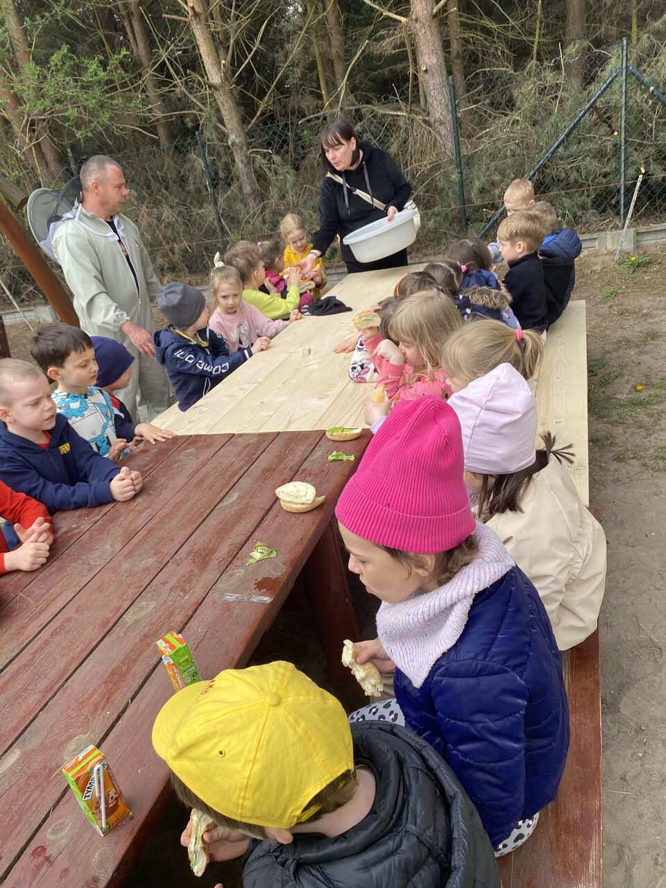 W trakcie wycieczki dzieci spędzały czas na świeżym powietrzu, bawiły się na placu zabaw. Na zakończenie odbyło się ognisko, podczas którego jadły kiełbasę z grilla.
