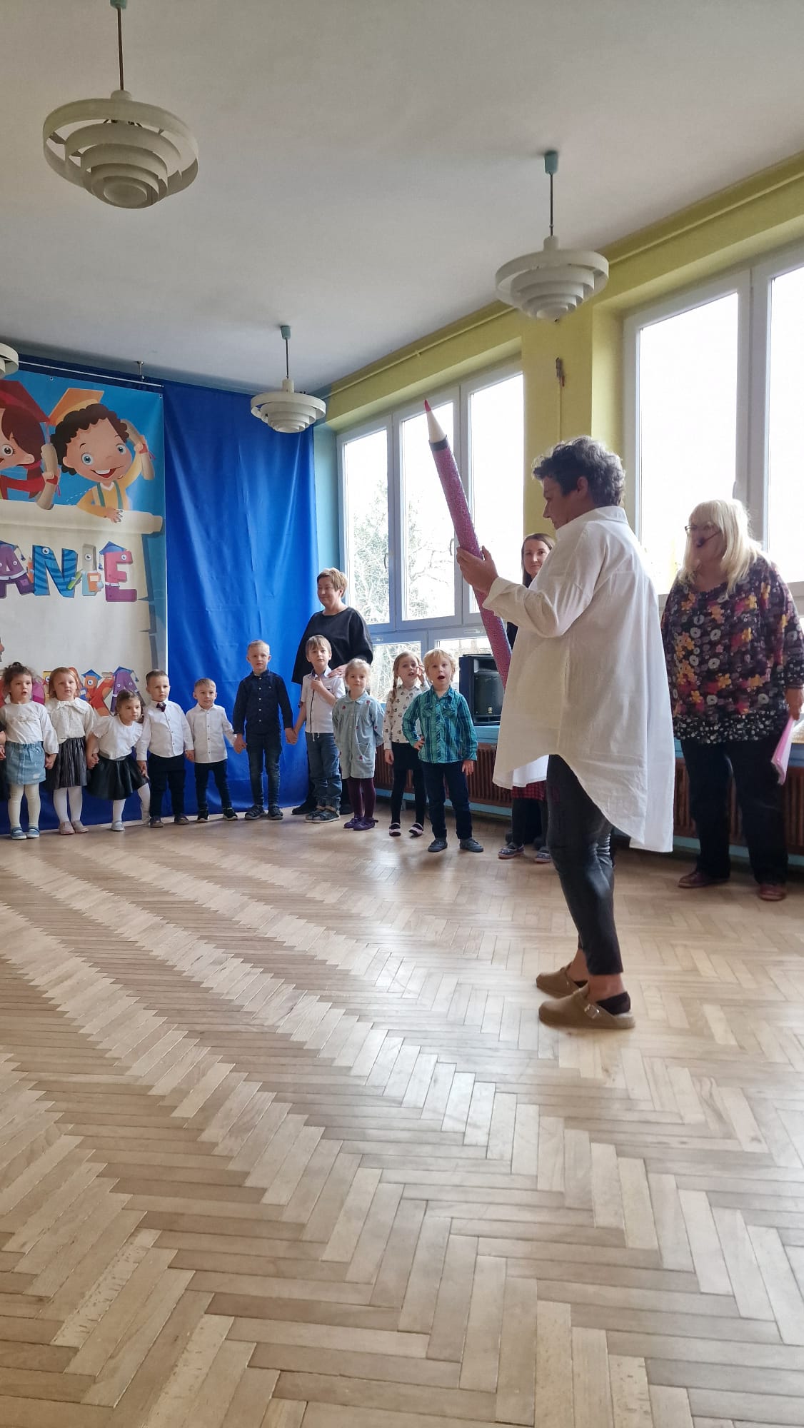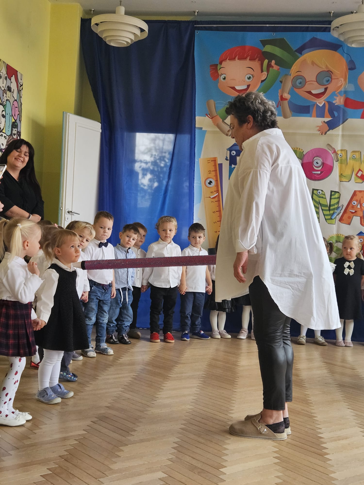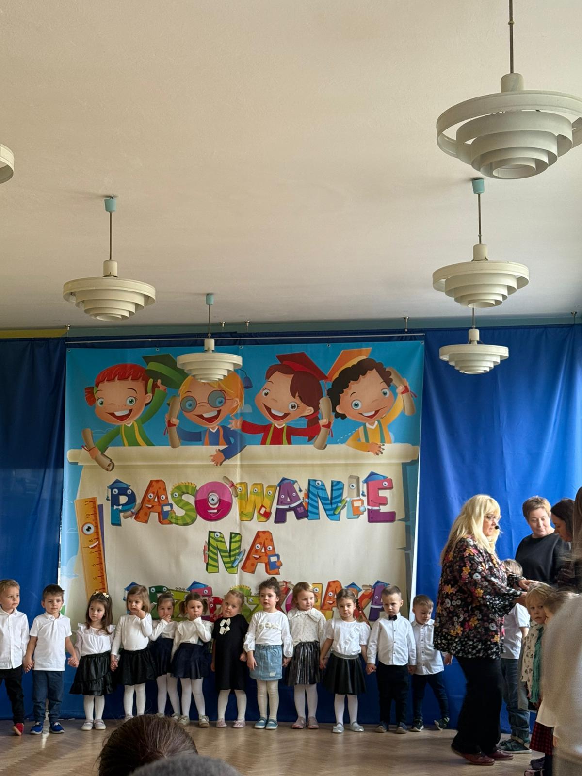 Kulminacyjnym momentem było pasowanie, podczas którego każde dziecko zostało dotknięte czarodziejskim ołówkiem. Ten symboliczny gest sprawił, że maluchy oficjalnie stały się prawdziwymi przedszkolakami. Na pamiątkę tego ważnego wydarzenia dzieci otrzymały dyplomy oraz książki.