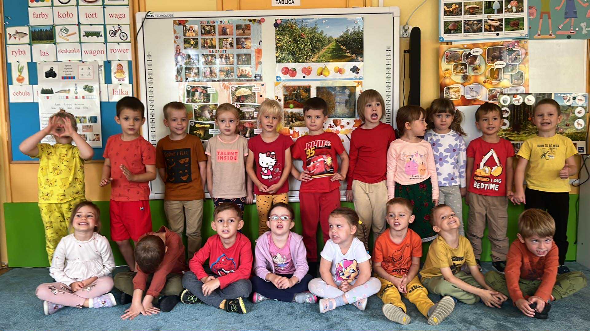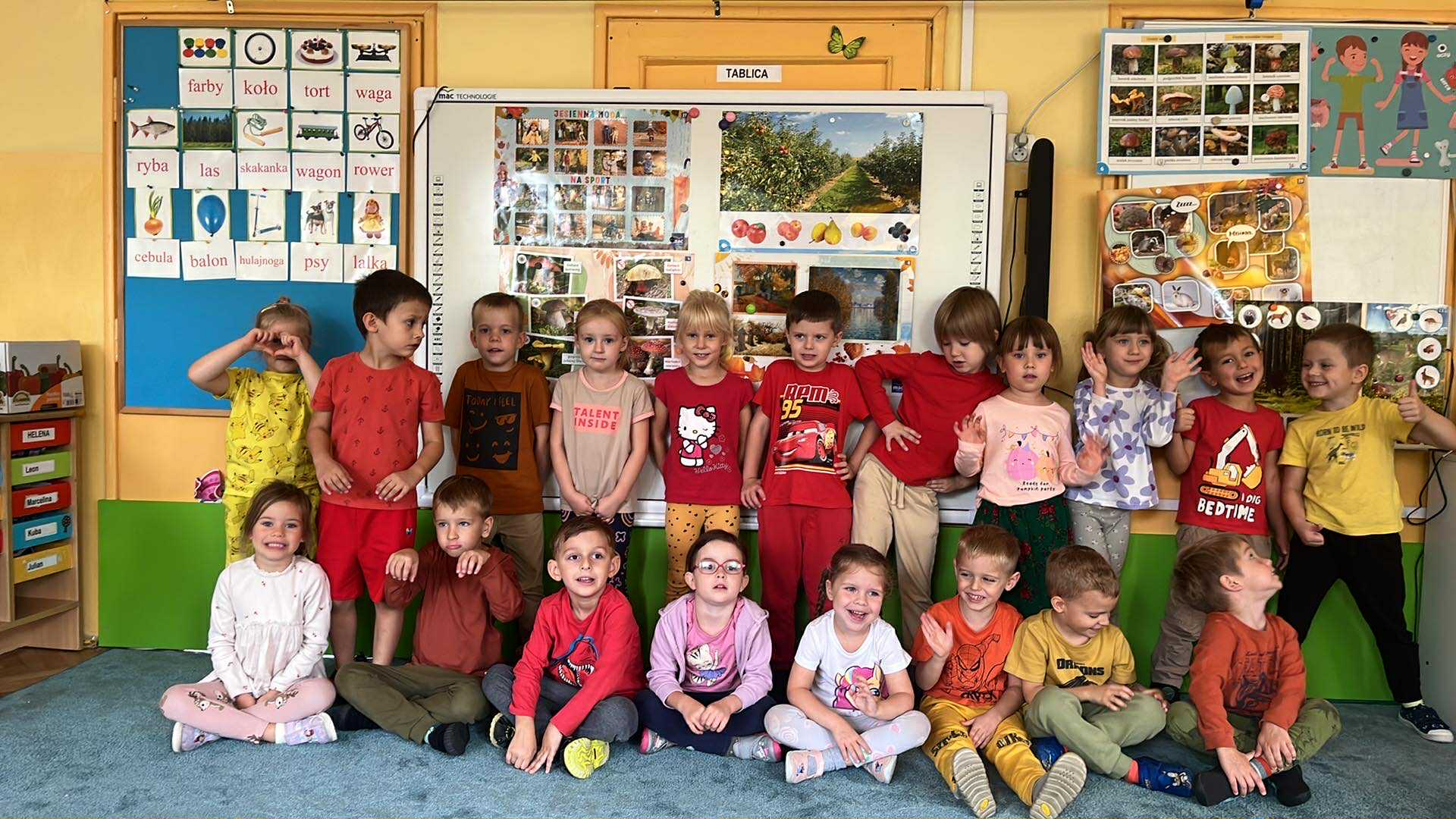 22 września nasze przedszkolaki powitały nową porę roku – JESIEŃ. Tego dnia w przedszkolu królowały kolory: brązowy, pomarańczowy, żółty i czerwony. Dzieci brały udział w zajęciach i zabawach o tematyce jesiennej, poprzez które zdobywały wiadomości o rozpoczynającej się porze roku. Celem zabaw związanych z tematyką było utrwalenie wiadomości o jesieni, integrowanie się dzieci, a przede wszystkim wspaniała wspólna zabawa.