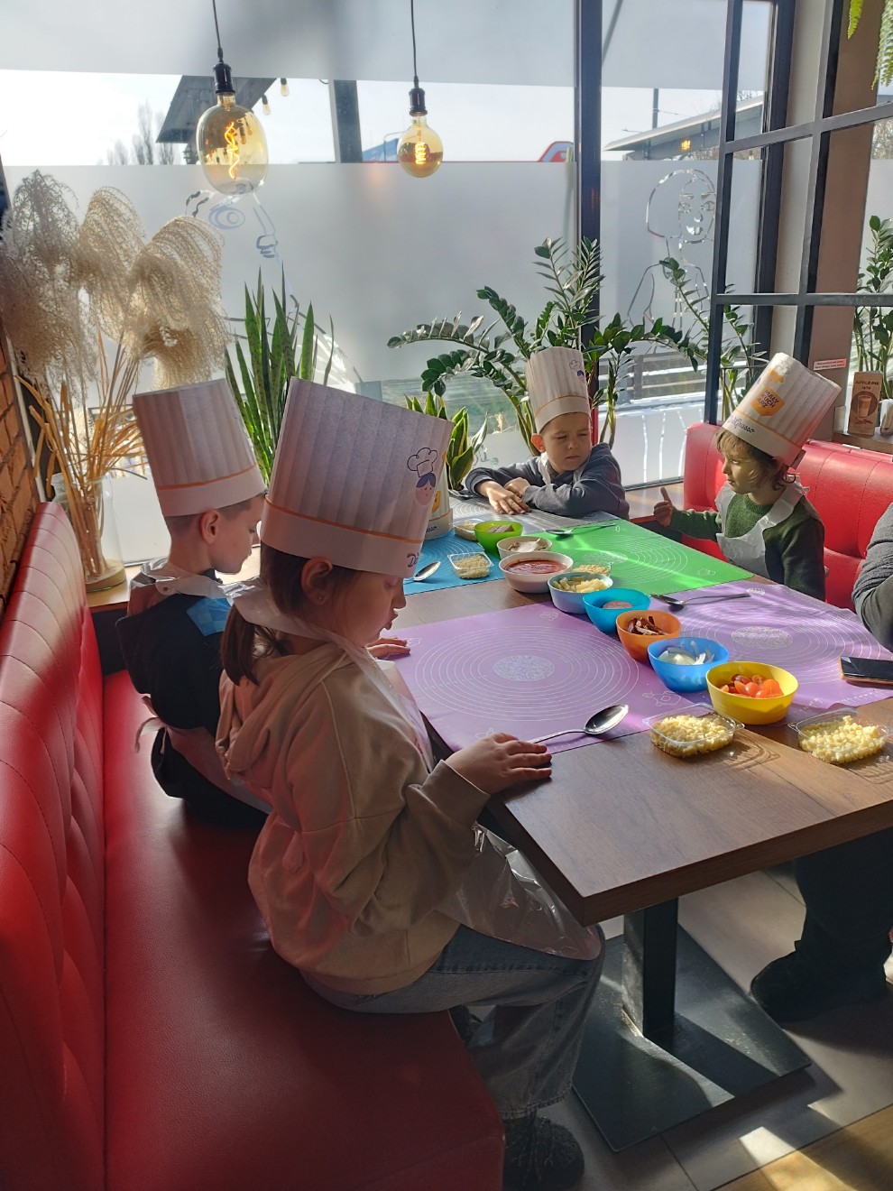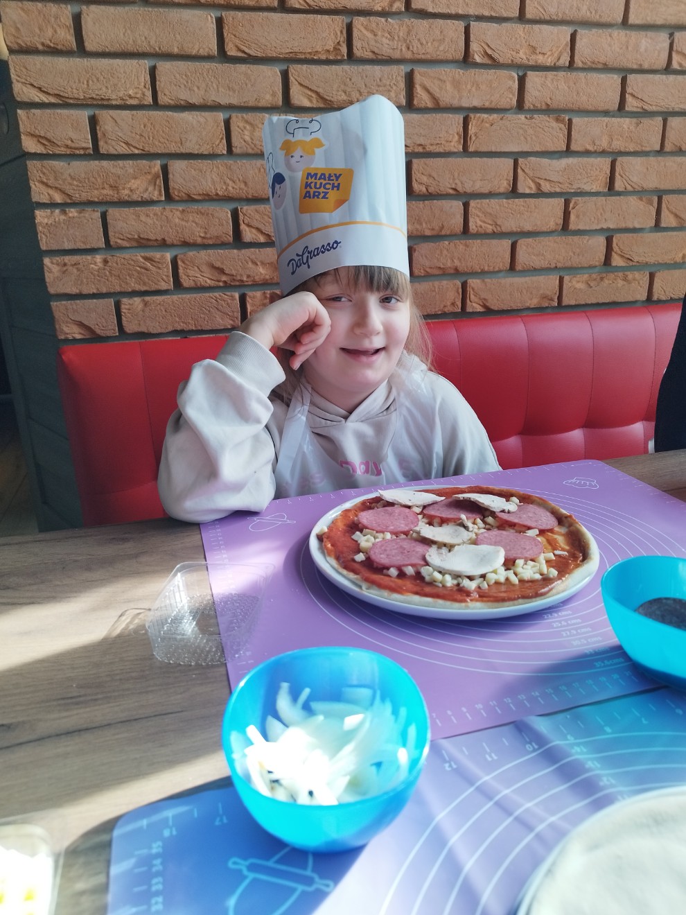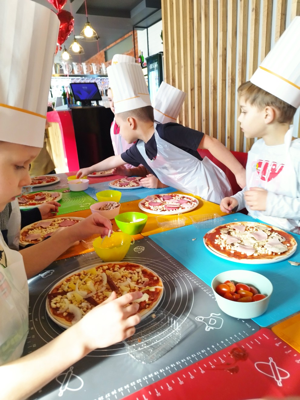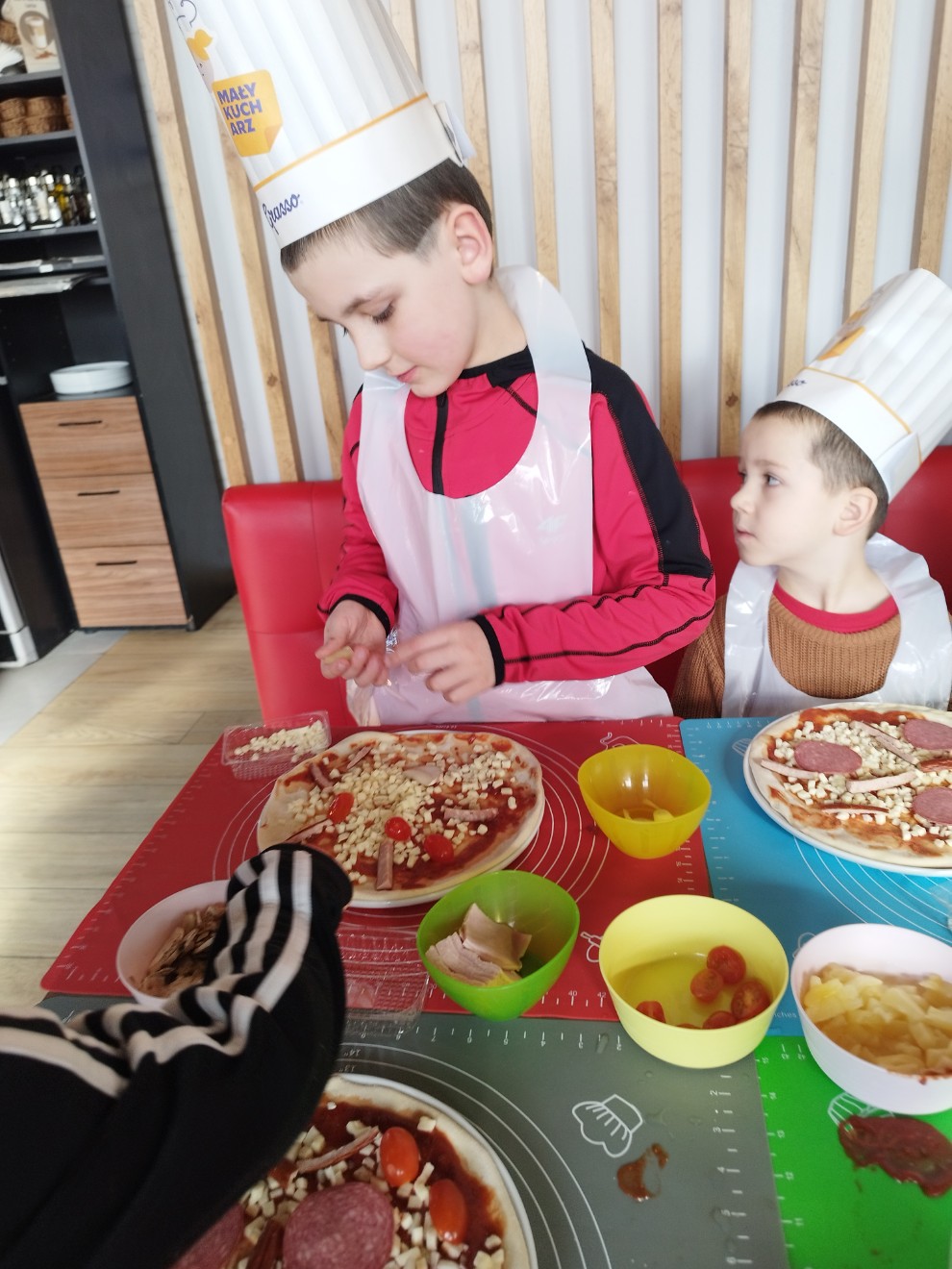 Podczas spotkania dzieci poznały zasady higieny i bezpieczeństwa obowiązujące w kuchni oraz dowiedziały się, z jakich składników powstaje pizza. Każde dziecko otrzymało wcześniej przygotowane, uformowane ciasto, które następnie smarowało sosem i komponowało z ulubionych dodatków. Warsztaty były doskonałą okazją do rozwijania sprawności manualnej, samodzielności oraz umiejętności dokonywania wyborów.