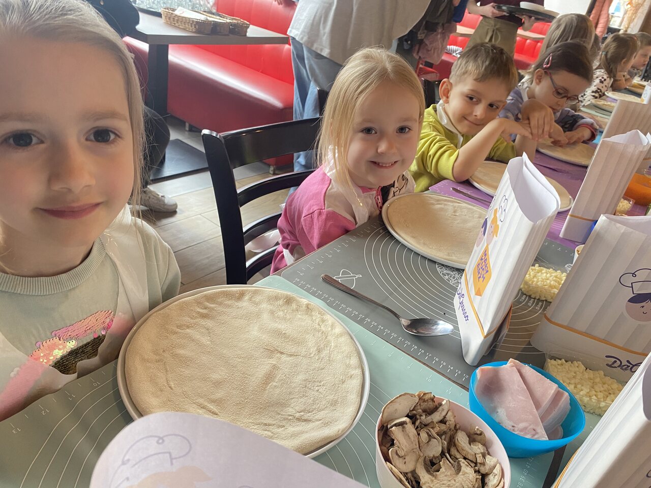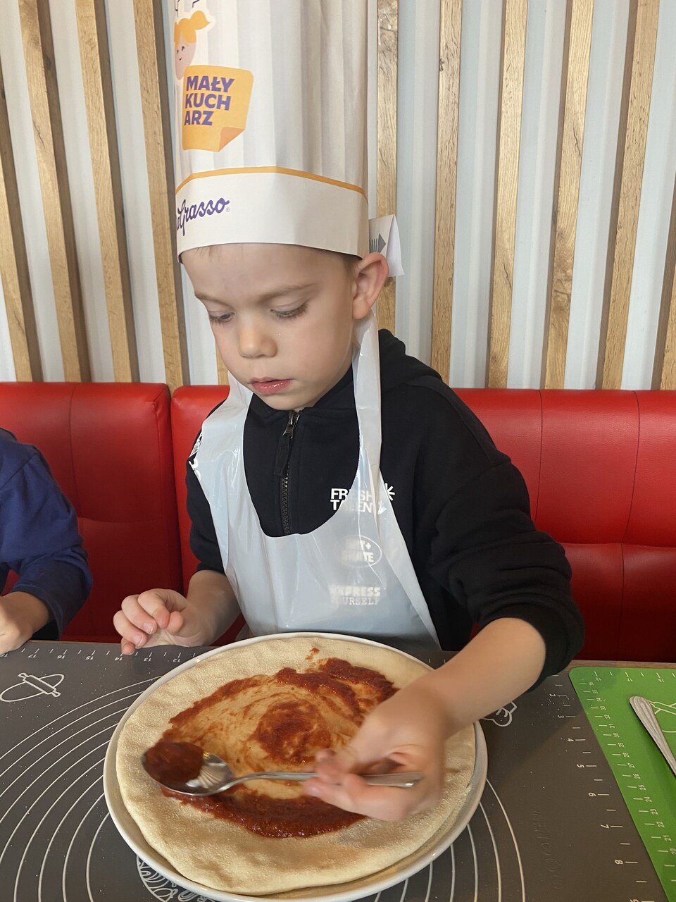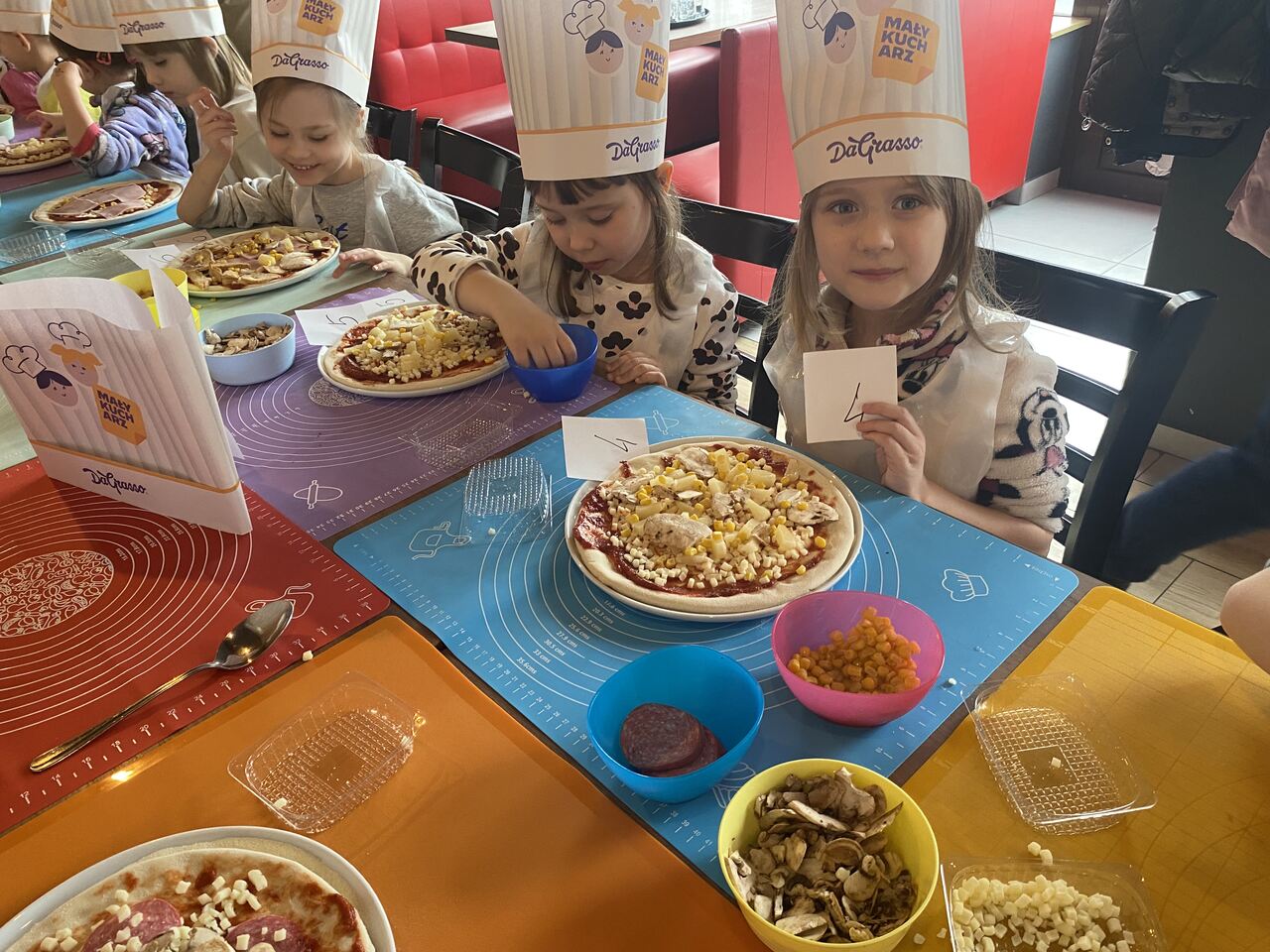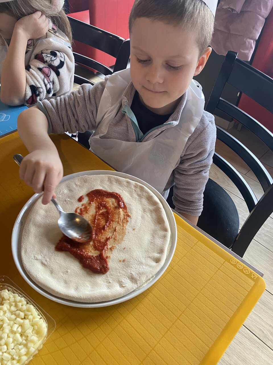Podczas spotkania dzieci poznały zasady higieny i bezpieczeństwa obowiązujące w kuchni oraz dowiedziały się, z jakich składników powstaje pizza. Każde dziecko otrzymało wcześniej przygotowane, uformowane ciasto, które następnie smarowało sosem i komponowało z ulubionych dodatków. Warsztaty były doskonałą okazją do rozwijania sprawności manualnej, samodzielności oraz umiejętności dokonywania wyborów.