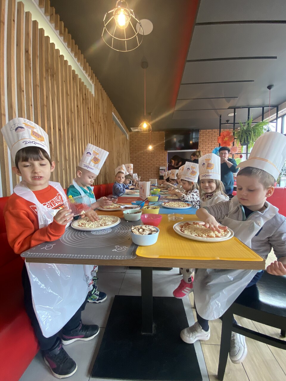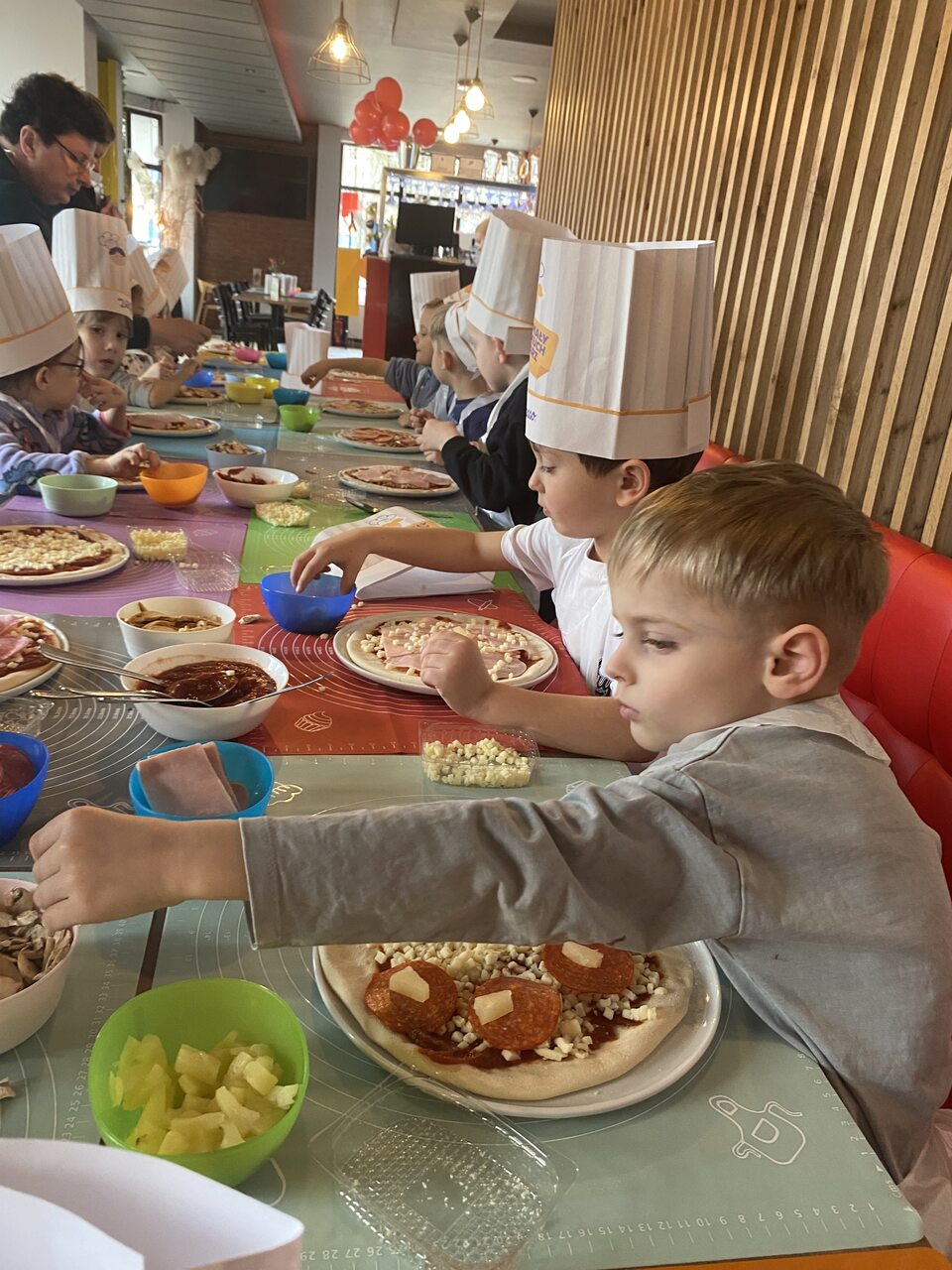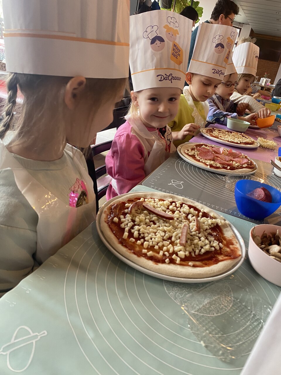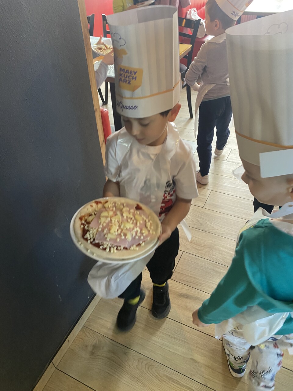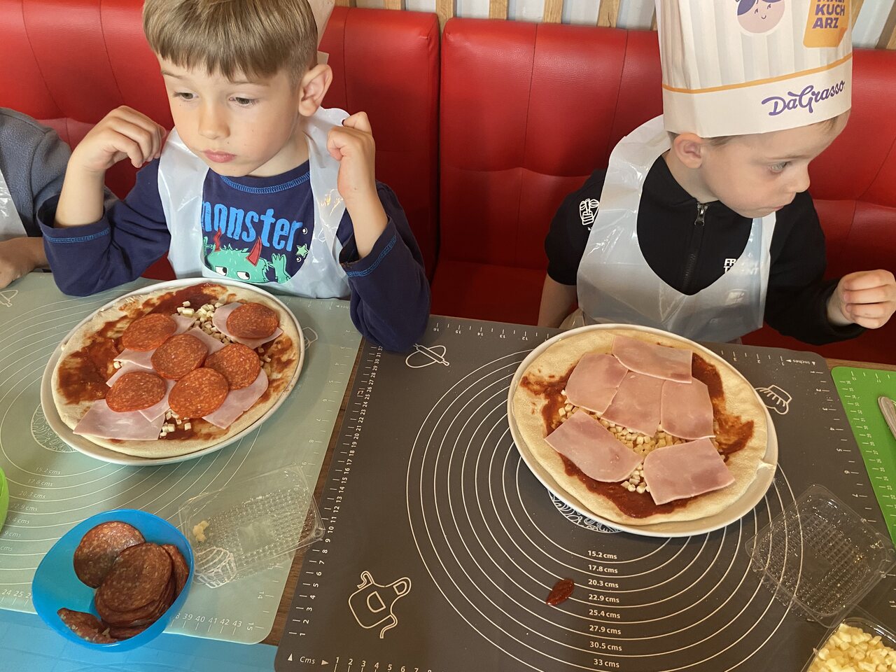 Podczas spotkania dzieci poznały zasady higieny i bezpieczeństwa obowiązujące w kuchni oraz dowiedziały się, z jakich składników powstaje pizza. Każde dziecko otrzymało wcześniej przygotowane, uformowane ciasto, które następnie smarowało sosem i komponowało z ulubionych dodatków. Warsztaty były doskonałą okazją do rozwijania sprawności manualnej, samodzielności oraz umiejętności dokonywania wyborów.