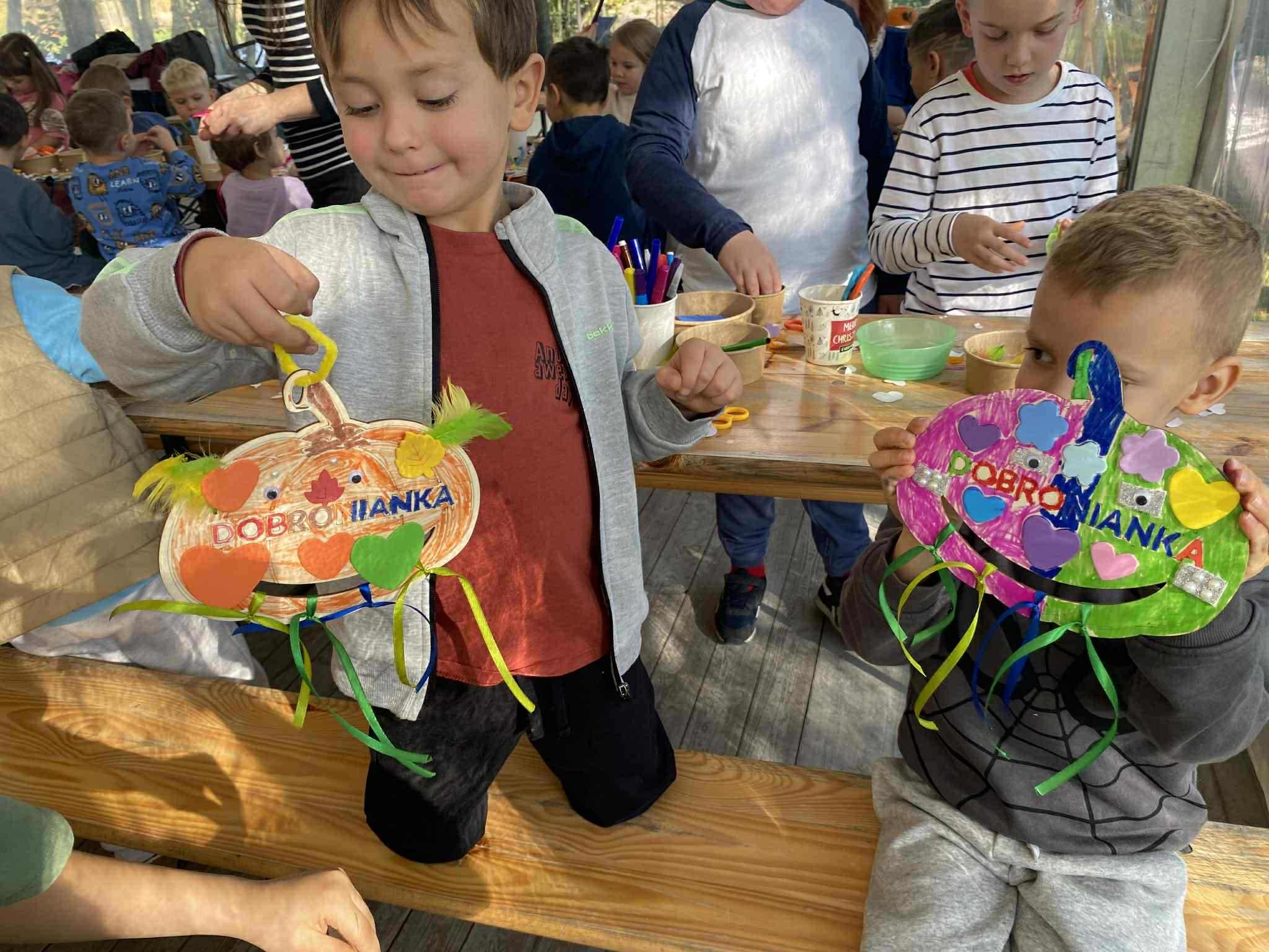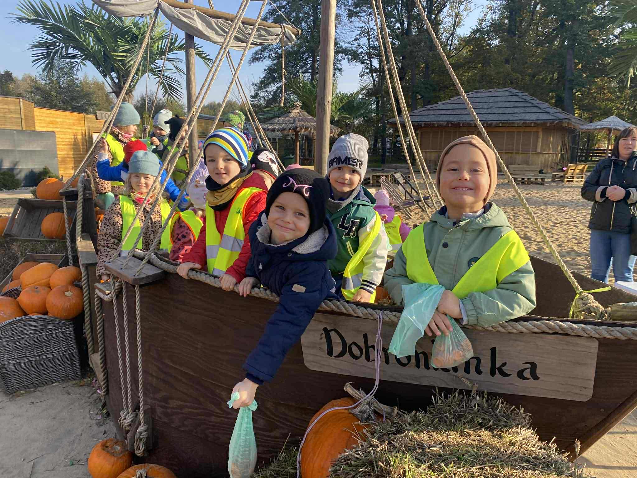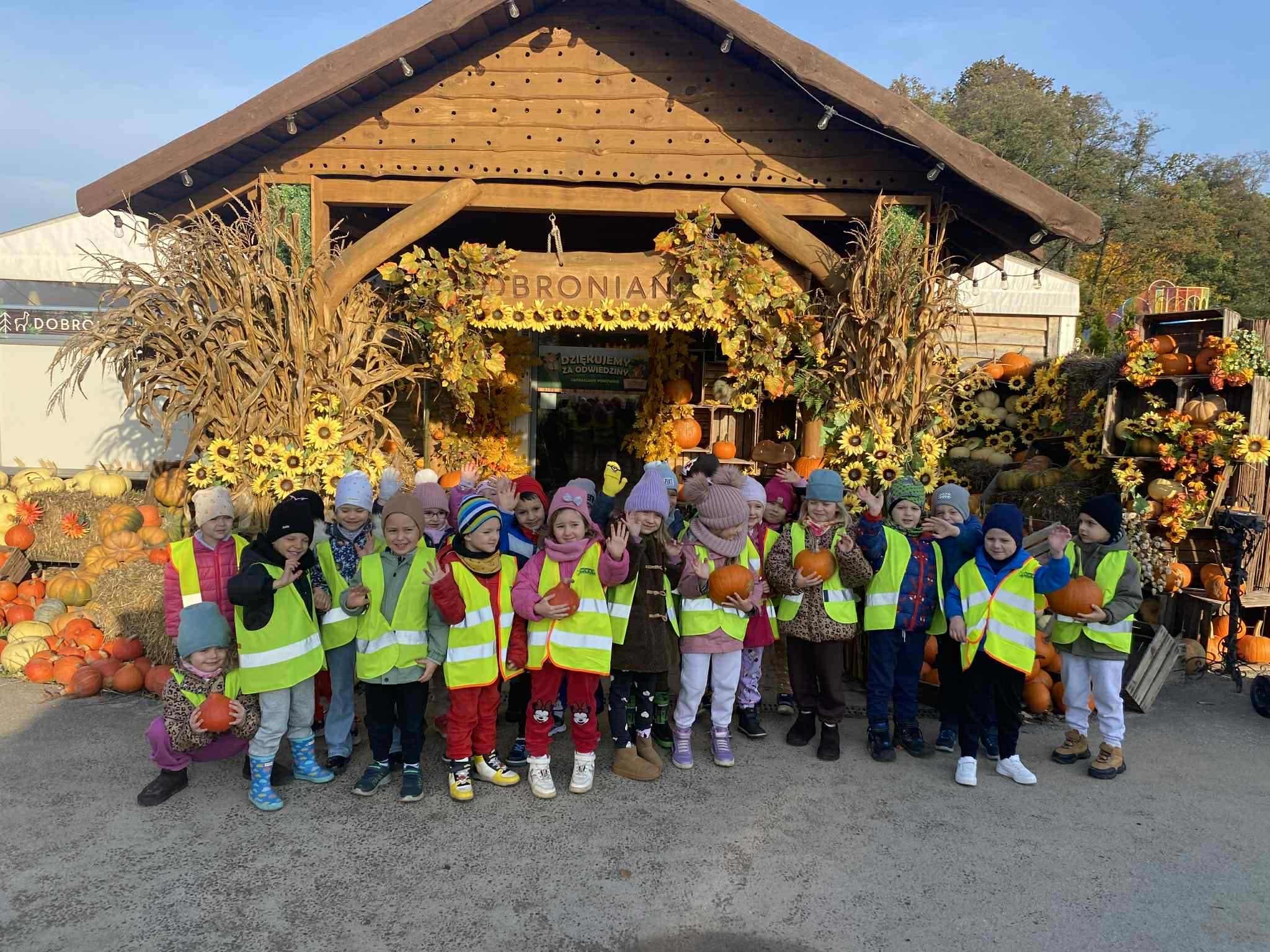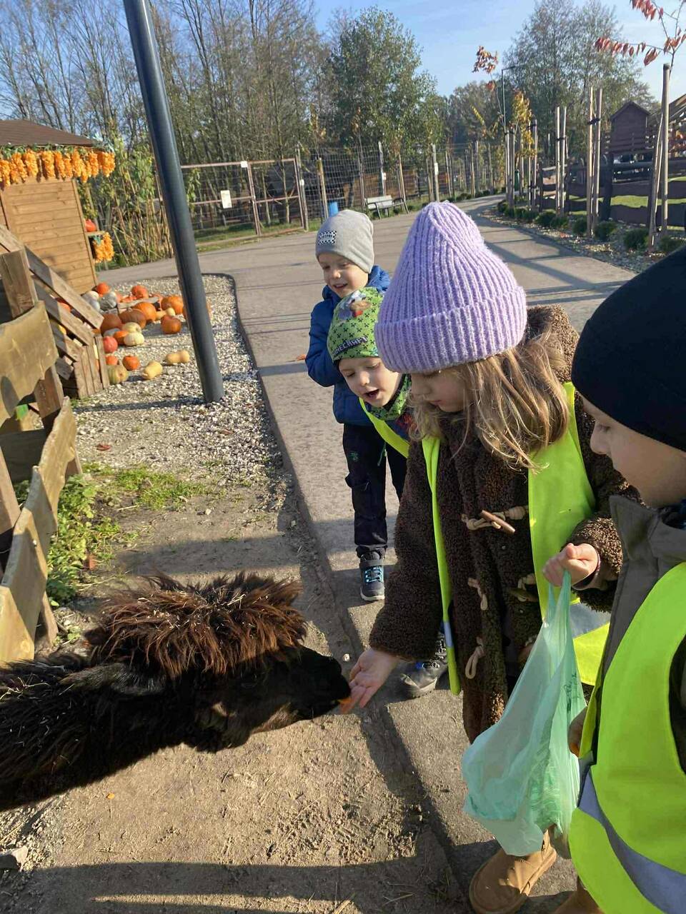 22.10.2025 r. dzieci z naszego przedszkola wybrały się na wycieczkę do Dobronianki w Dobroniu. Celem wycieczki były: obserwacja i czerpanie pozytywnych wrażeń w kontakcie z przyrodą, zainteresowanie różnorodnością gatunkową świata zwierząt oraz kształtowanie świadomości ekologicznej. Przedszkolaki miały możliwość poznać różne zwierzęta takie jak: alpaki, kozy, konie, wielbłądy, osły, mary, króliki, pawie i wiele innych, a także karmić niektóre z ich marchewkami oraz wysłuchać ciekawostek na ich temat. Po zwiedzaniu zoo udaliśmy się na warsztaty plastyczne „Zdobienie drewnianych dyń”, podczas których dzieci rozwijały zdolności manualne i inwencję twórczą. Pobyt w zoo dostarczył najmłodszym wiele radości oraz był wspaniałą lekcją przyrody przeżytą w ciekawym i atrakcyjnym miejscu.