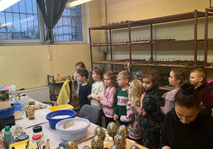 Po zwiedzaniu fabryki przyszła pora na kreatywną zabawę! Dzieci wzięły udział w warsztatach, gdzie własnoręcznie zdobiły bombki. Z zaangażowaniem malowały i ozdabiały swoje małe dzieła sztuki, które będą piękną pamiątką tego wyjątkowego dnia.